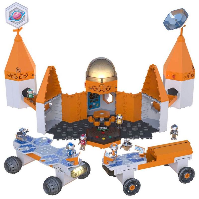 Конструктор "Космическая миссия. Базовая станция" (EI-4202) – самый большой набор для юных космонавтов: Базовая станция с башнями и вращающейся вывеской, планетарий с куполом, меняющим цвет, 2 вездехода (с питанием и автономный), станция голосового синтезатора с 10 космическими звуками.