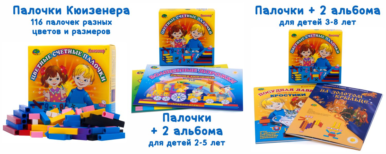 В нашем магазине представлены палочки Кюизенера от бренда «Корвет», а также наборы палочек с заданиями для детей от 2 до 5 и от 3 до 8 лет. Весь ассортимент представлен здесь.