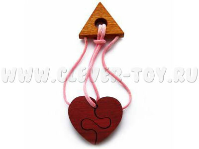 - Головоломка "Разбитое сердце - 1" (дерево). Задача: соедините обе части сердечка так, чтобы им не мешал шнурок. Постарайтесь не запутаться в переплетениях шнура. Уровень сложности: 5 из 7.