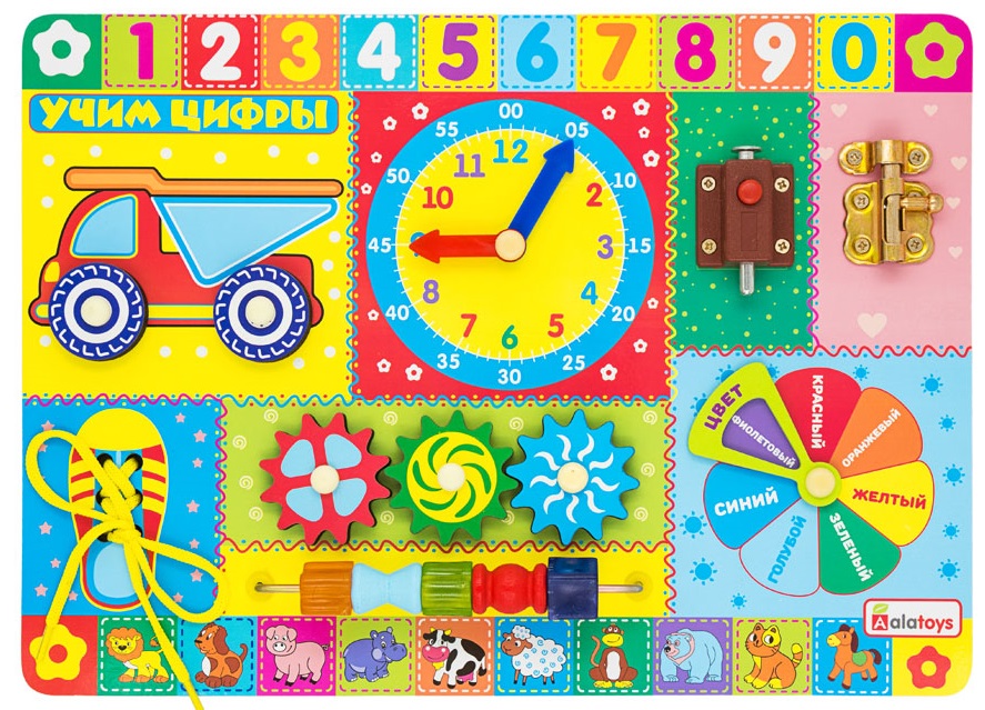 • развить мелкую моторику с помощью рельефных бусин, щеколды, шестерёнок, колёсиков и шнуровки,