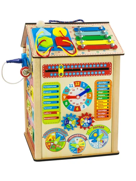 Бизидом (29*29*40 см). Большой игровой комплекс для детей младшего возраста. На одном домике собрано огромное количество занимательных для вашего малыша игр: розетка, вилка, шнуровка, колёсики, цветные дверцы, шестирёнки, счёты, часики, времена года, календарь, ксилофон, геометрические фигуры, - вот далеко не полный список игровых элементов этого уникального домика.
