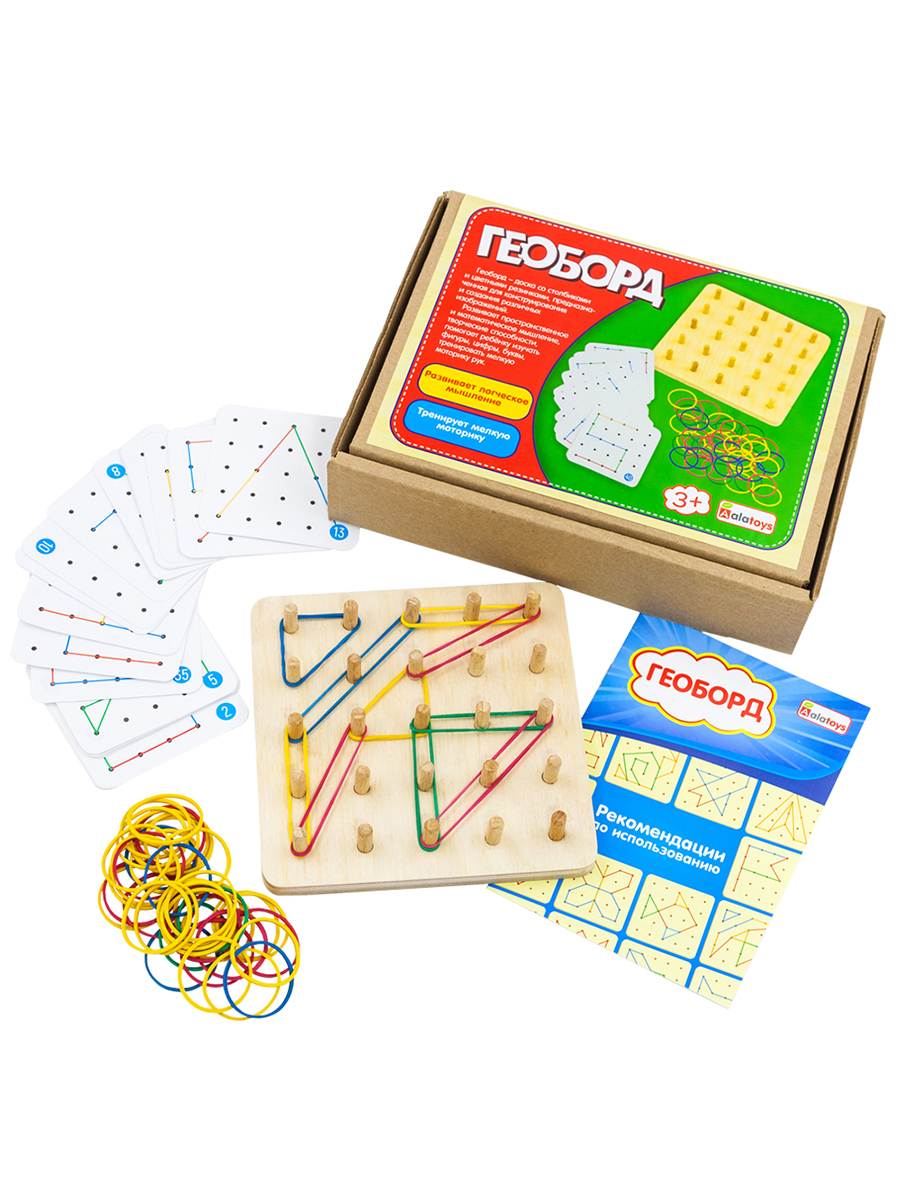 Геоборд (14*14 см, основание, 20 карточек, 50 резинок). Деревянная доска-основание со штырьками, между которыми натягиваются резиночки. С помощью резинок ребенок рисует на основании цифры, буквы, здания, транспорт, фигуры, симметричные узоры. Вы можете повторять рисунки со схем из комплекта, или придумывать свои.