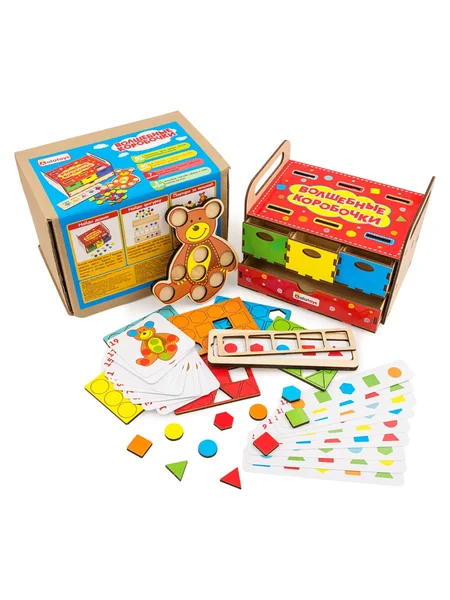 Волшебные коробочки. Чудесная, яркая, экологичная развивающая игра: 7 ящичков, 80 деталей разных цветов и форм, 20 карточек с заданиями, сортер медвежонок с карточкой. Играя, ребёнок с радостью будет сортировать детали по цветам и формам, решать задания на карточках, развивать мелкую моторику.