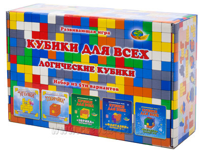 «Кубики для всех» 27 отдельных кубиков определенных цветов, соединенных между собой особым образом. В результате получаются фигуры разной конфигурации. Игра развивает внимание, память, логическое мышление, смекалку и сообразительность, усидчивость, моторику, фантазию.