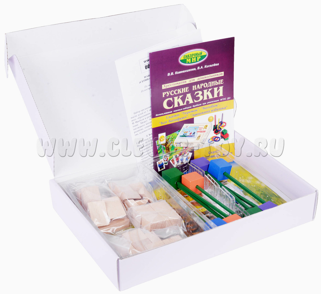 • методические рекомендации для педагогов («Хрестоматия для дошкольников “Русские народные сказки”. Использование игровых наборов Фрёбеля при реализации ФГОС ДО». Авторы: В.В. Кожевникова, В.А. Киселева – 28 страниц – печать офсетная, обложка полноцвет.) - 1 шт.