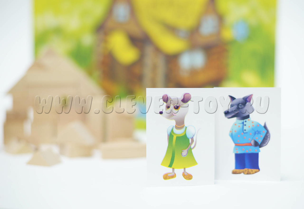 • карточки с персонажами формата 7*5 см – 8 шт. (лягушка, мышка, волк, комарик, медведь, лиса, муха, зайчик);