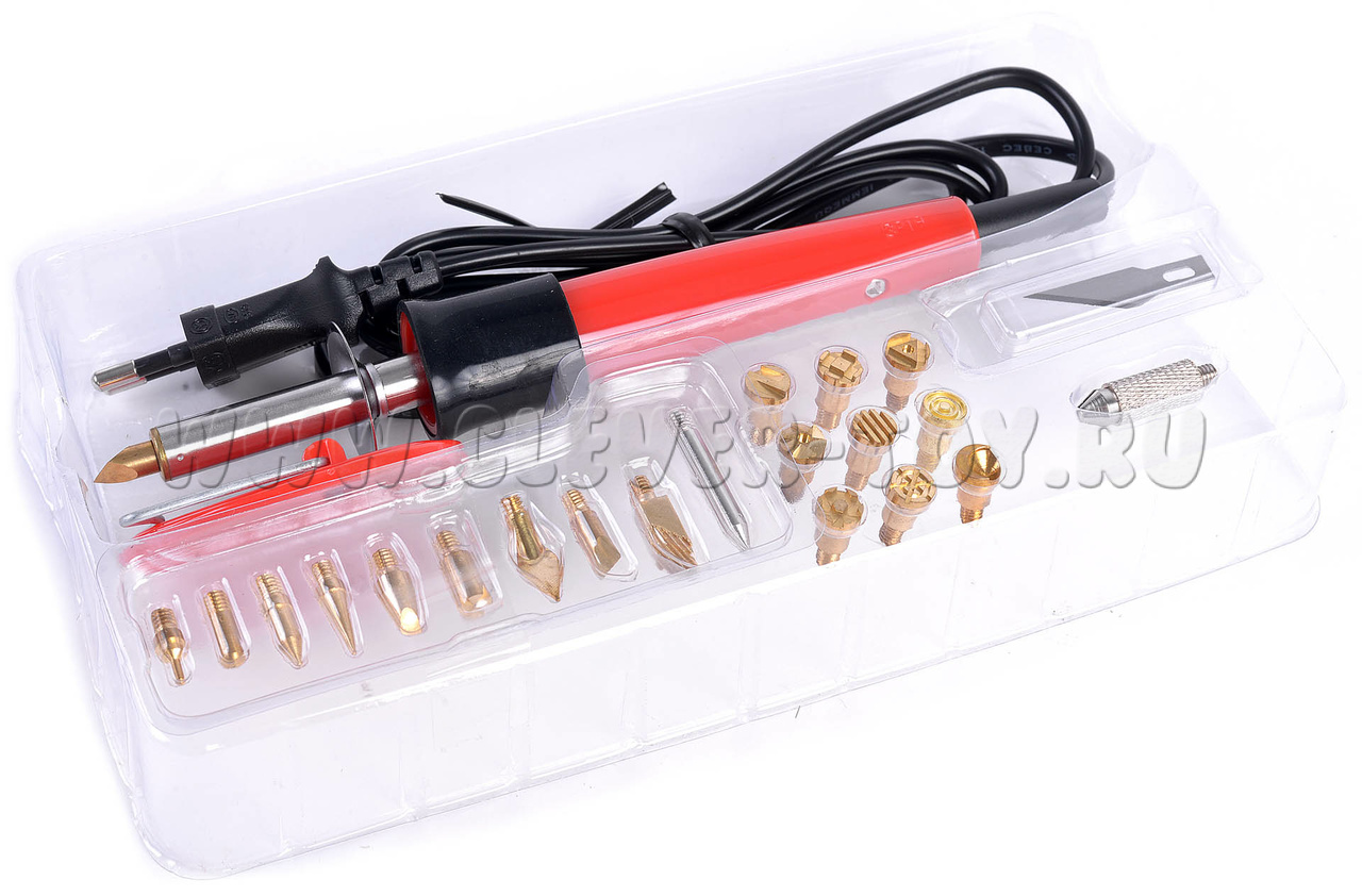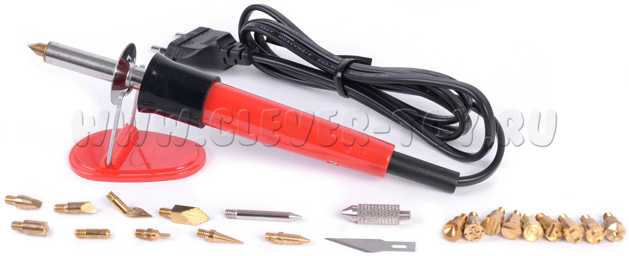Выжигатель рисует тончайшие линии, с его помощью можно создавать великолепные художественные работы и даже выжигать портреты. Фигурные насадки в комплекте позволят выводить фигурные узоры, переносить самые смелые идеи и яркие фантазии на полотно. Выжигает на любых породах древесины. К комплекту прилагается инструкция, доступно объясняющая принцип работы прибора.