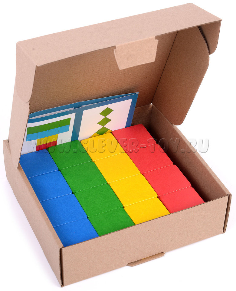 Из деревянных разноцветных кубиков "Мозаика" дети сами смогут придумывать разнообразные фигуры или складывать их по образцам на карточках-заданиях.