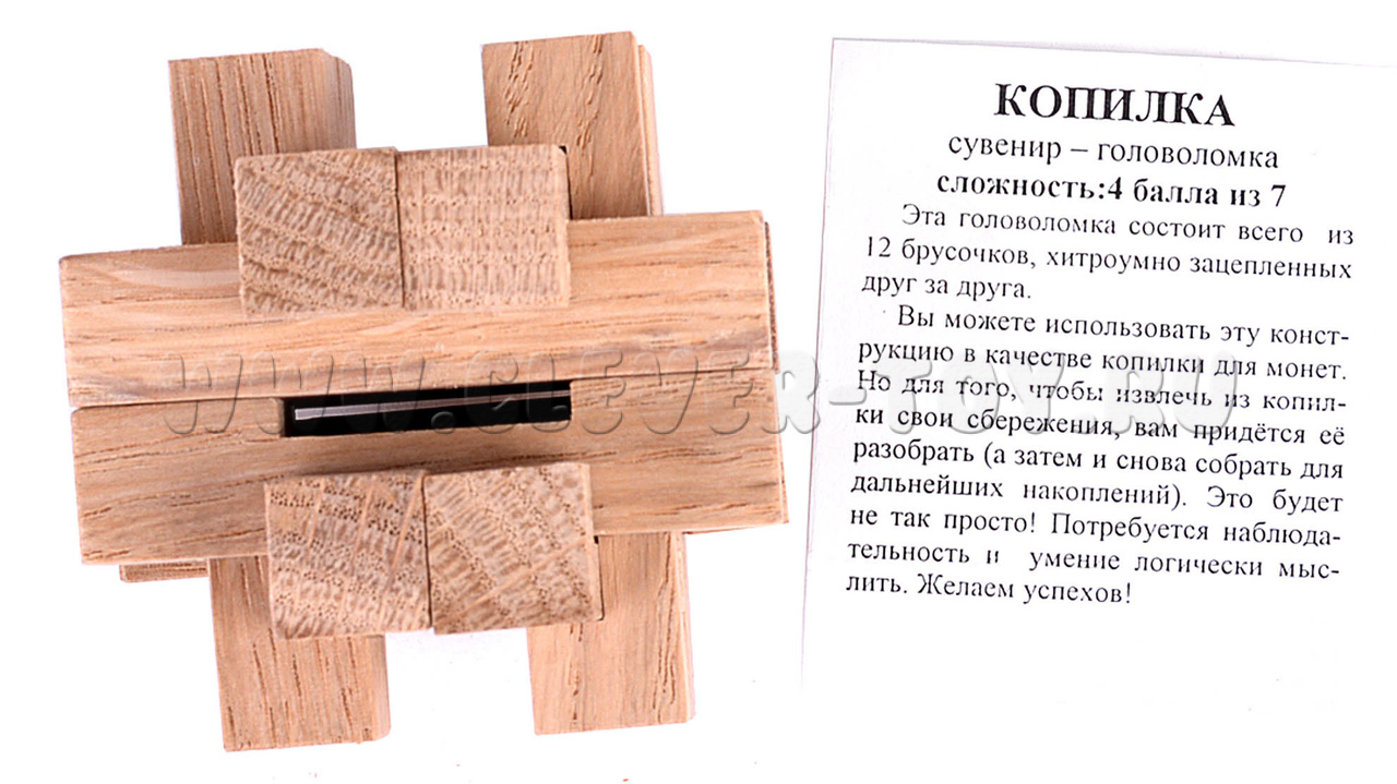 Головоломка “Копилка” - это сувенир из 12 деревянных брусков, умело зацепленных друг за друга. Задача игрока состоит в том, чтобы разобрать головоломку и вернуть ее в исходное состояние, используя свое логическое мышление.