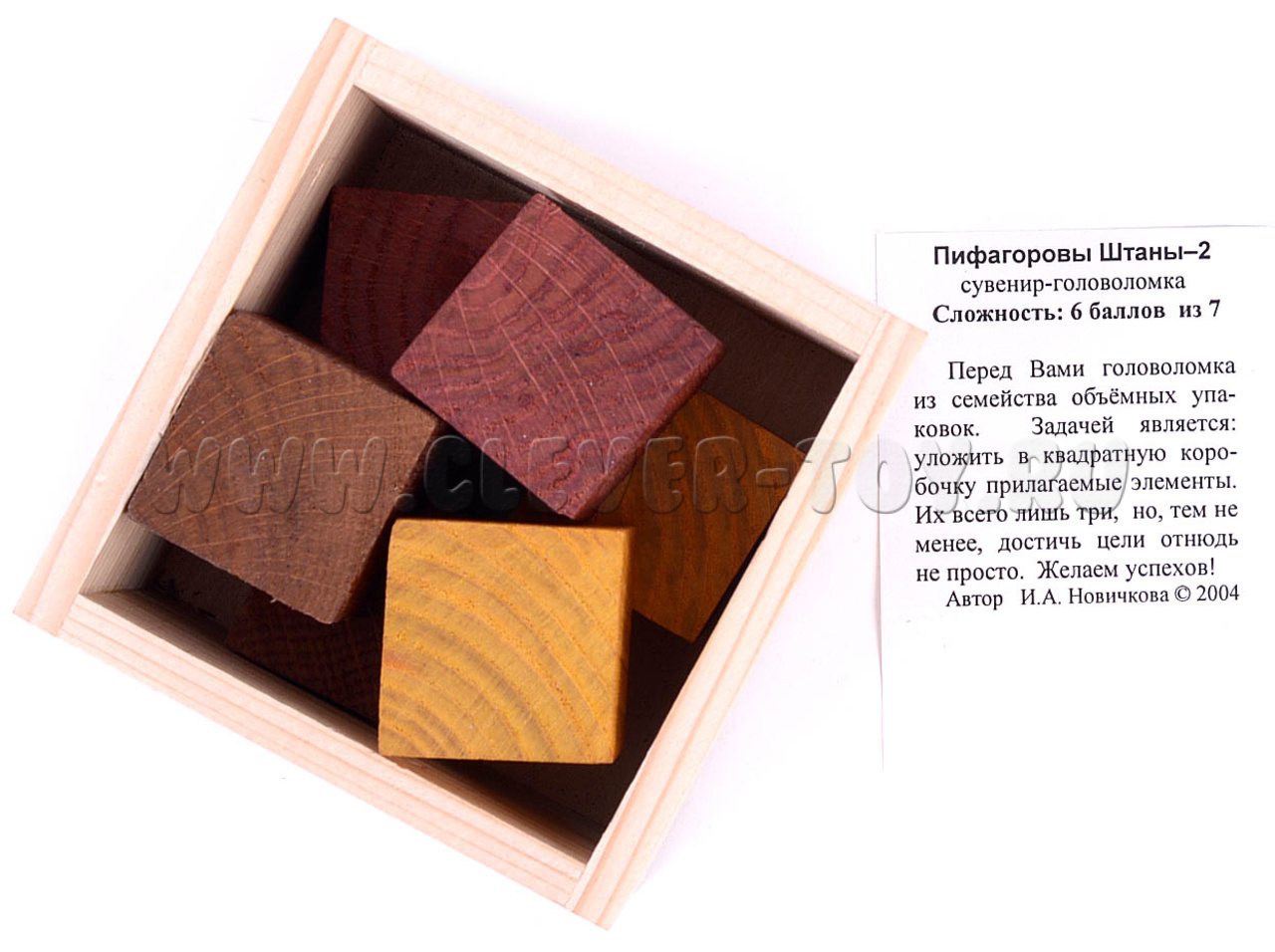 Уложить в квадратную коробочку прилагаемые элементы. Их всего лишь три (каждый элемент - это сдвоенные кубики),но, тем не менее, достичь цели довольно сложно.