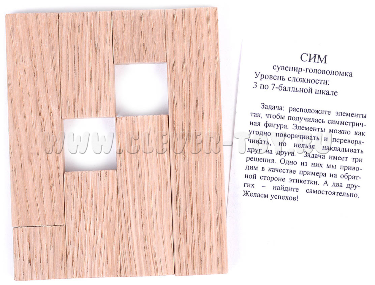 В головоломке “СИМ” требуется расположить элементы так, чтобы получилась симметричная фигура. Элементы могут быть повернуты и перевернуты, но нельзя накладывать один на другой.