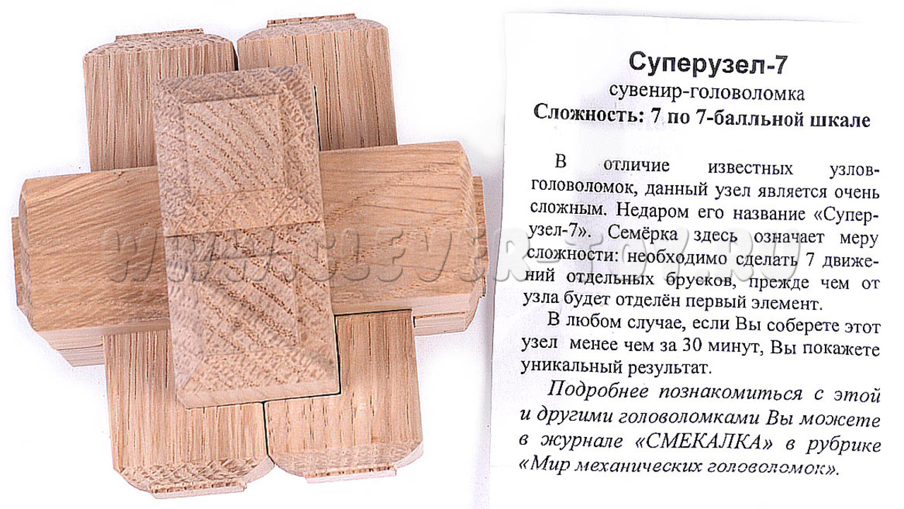 Головоломка Суперузел-7 представляет собой кубическую структуру, состоящую из нескольких индивидуальных брусков, соединенных между собой. Цель игры состоит в том, чтобы сначала разобрать, а потом собрать головоломку. Оба задания сложные.
