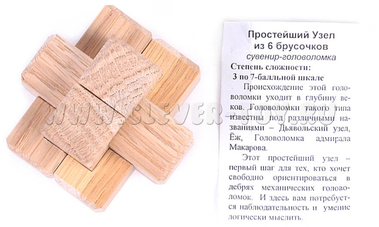 Головоломка "Узел" - это трехмерная головоломка, состоящая из шести одинаковых элементов. Данная головоломка является начальным этапом к освоение головоломок такого “узлового” типа. Задача игрока - правильно соединить все шесть элементов и собрать узел.