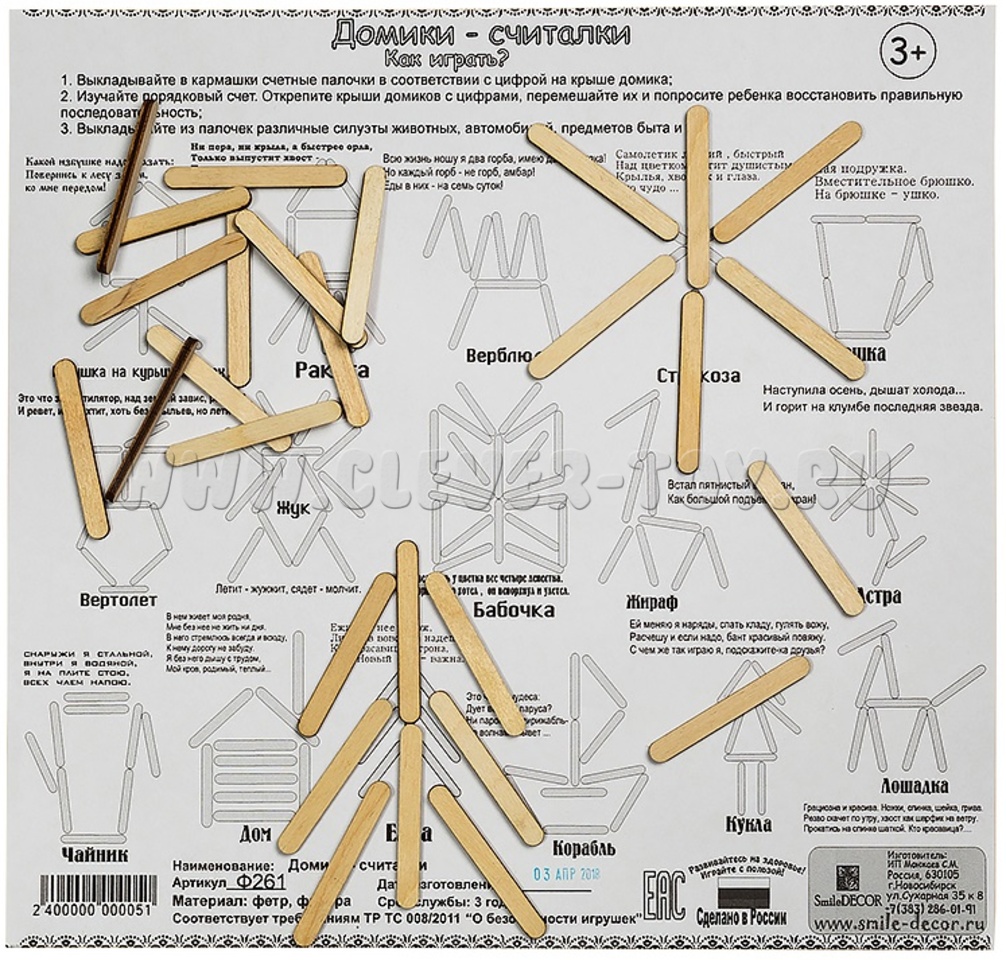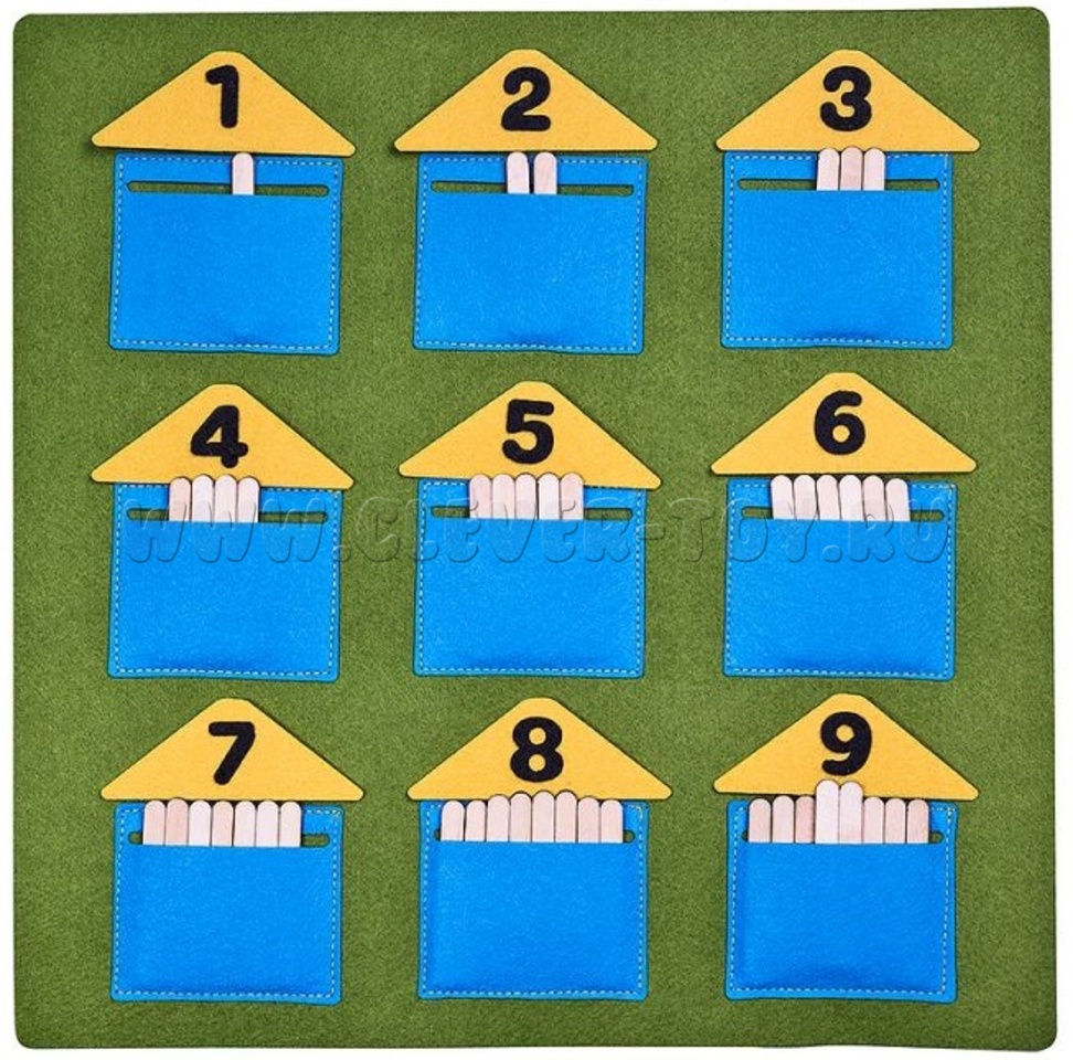 1. Выкладывайте в кармашки счетные палочки в соответствии с цифрой на крыше домика;