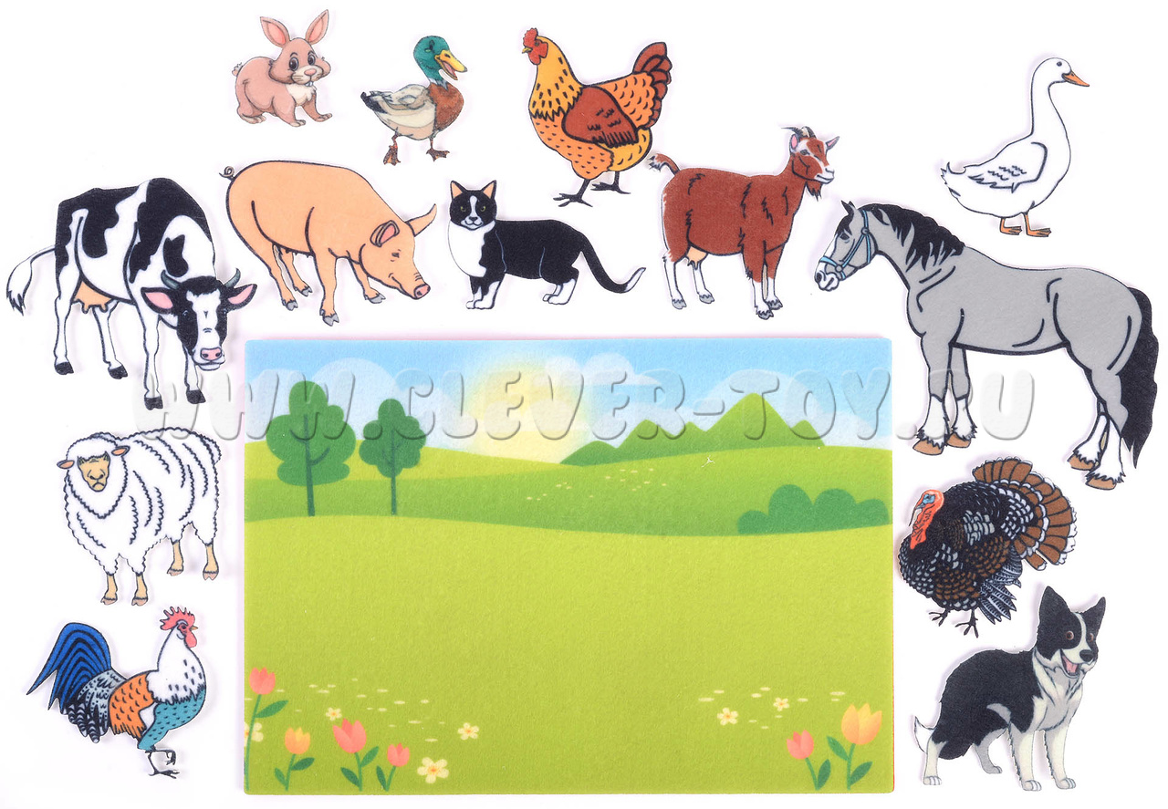 Развивающая игра-конструктор из фетра "Ферма". Комплектация: Набор из 13 фигурок домашних животных, Игровое поле с карманом 20*30см. Материал: фетр.