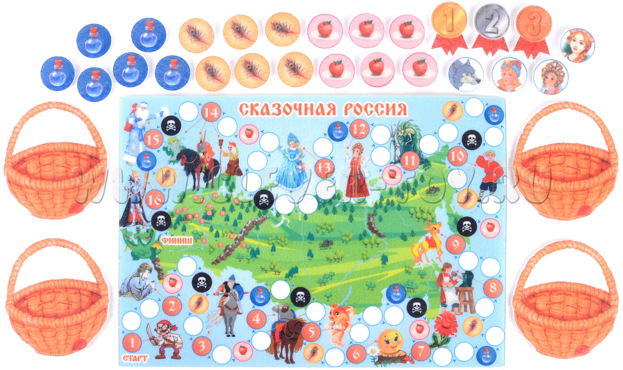• 1. ФИГУРКИ С ВОЛШЕБНЫМИ ПРЕДМЕТАМИ (волшебное яблочко на тарелочке, живая вода, перо Жар-птицы) занимают соответствующие изображениям поля на карте.