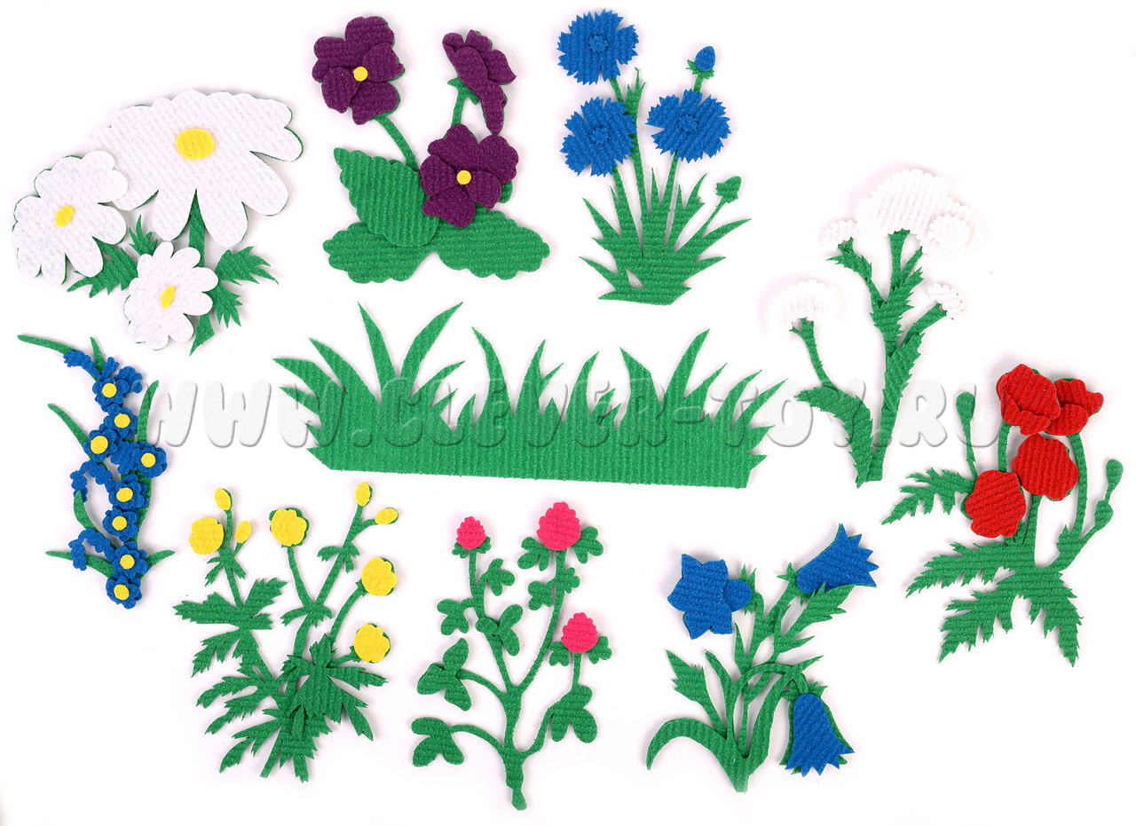 • 8 разнообразных видов луговых цветов, в том числе: мак, колокольчик, ромашка, василёк, лютики, фиалки вместе со стеблями, листьями и травой;