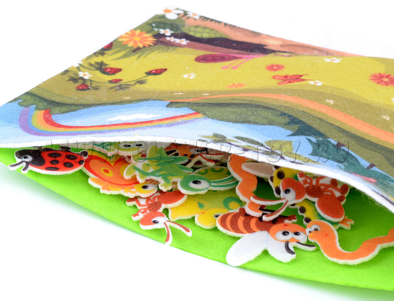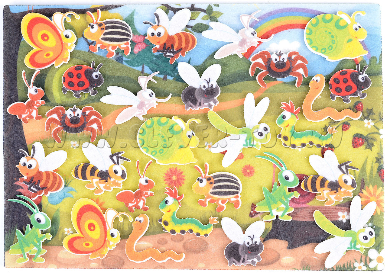 • 14 пар насекомых: кузнечики, мухи, пчёлы, червяки, комары, бабочки, улитки, гусеницы, муравьи, паучки, божья коровки, колорадские жуки, осы, - все они выполнены в мультипликационном стиле, весёлые и яркие, легко крепятся на игровое поле с помощью многоразовых липучек;