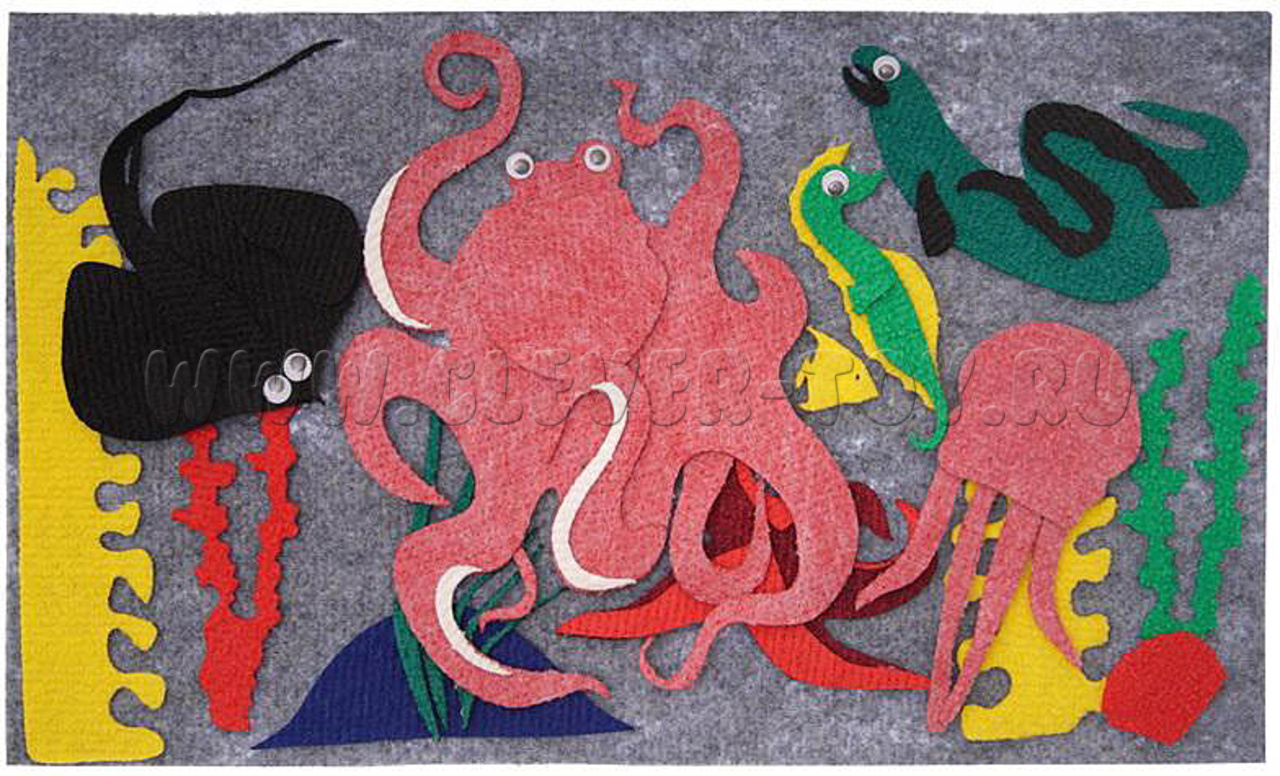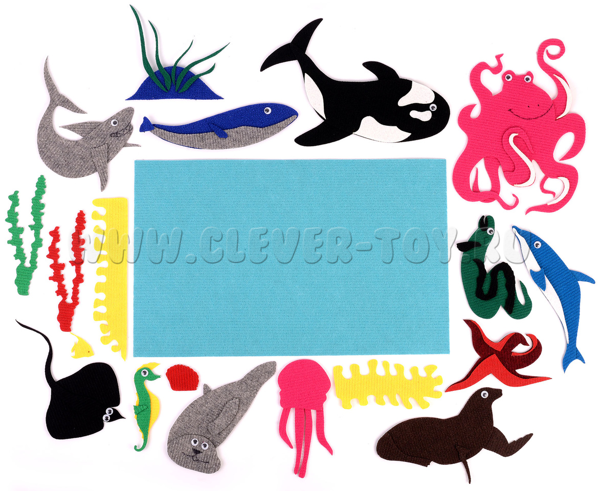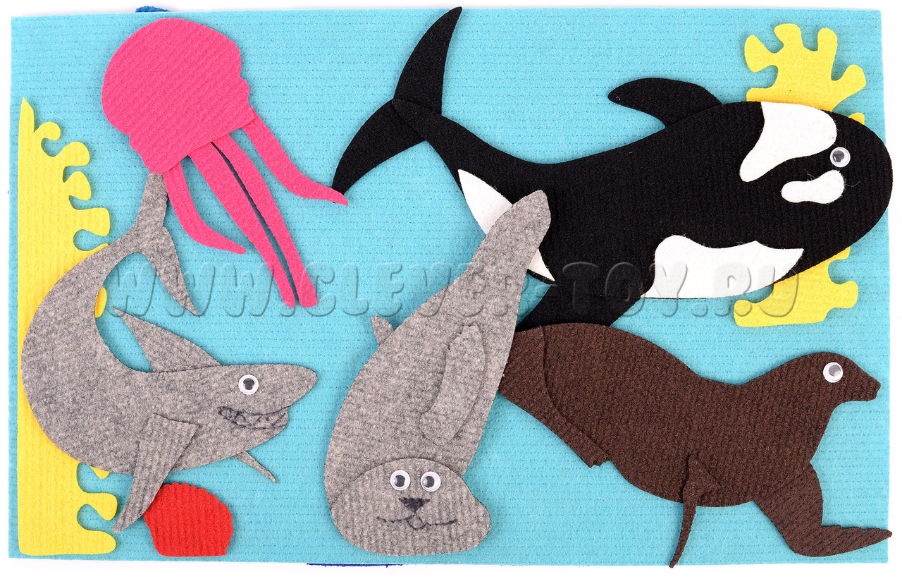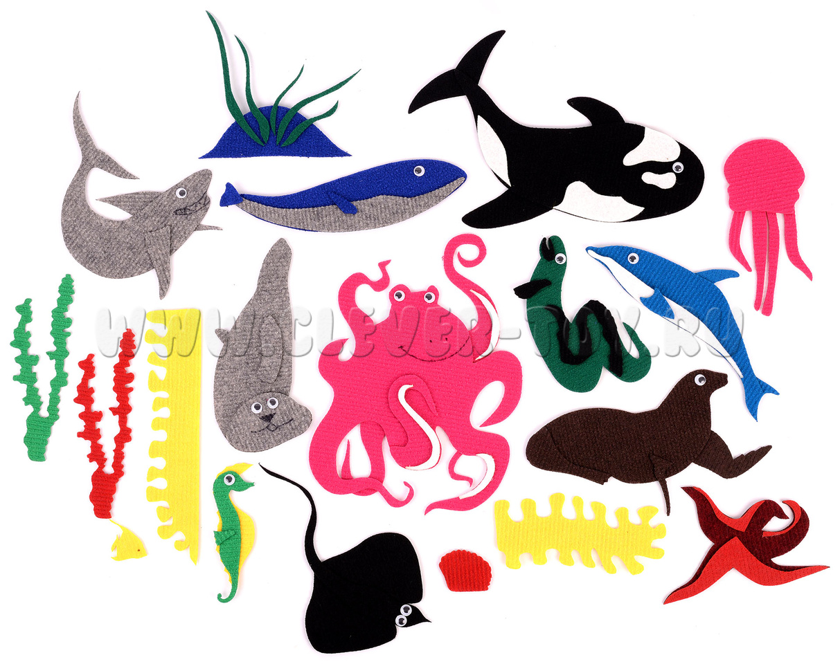 • обитатели моря: осьминог, касатка, морской котик, тюлень, кит, акула, скат, медуза, морской конёк, дельфин, мурена, морская звезда, рыбка;