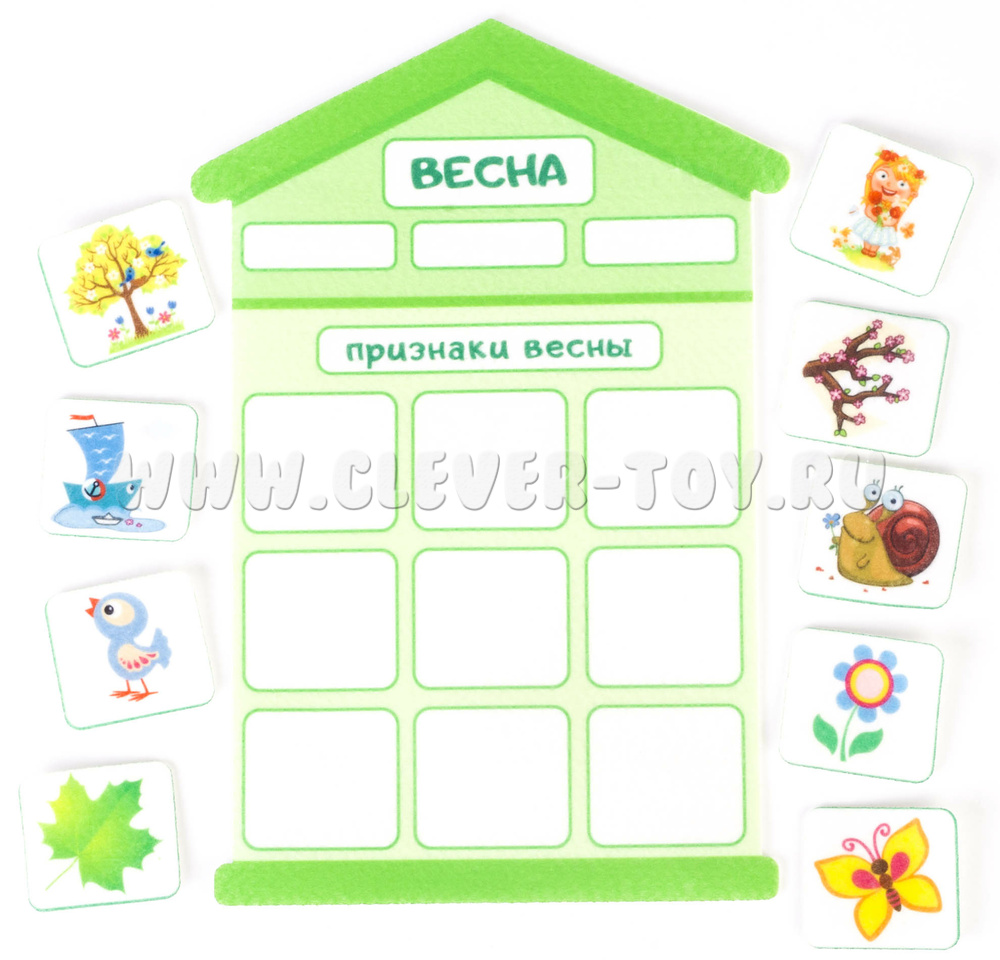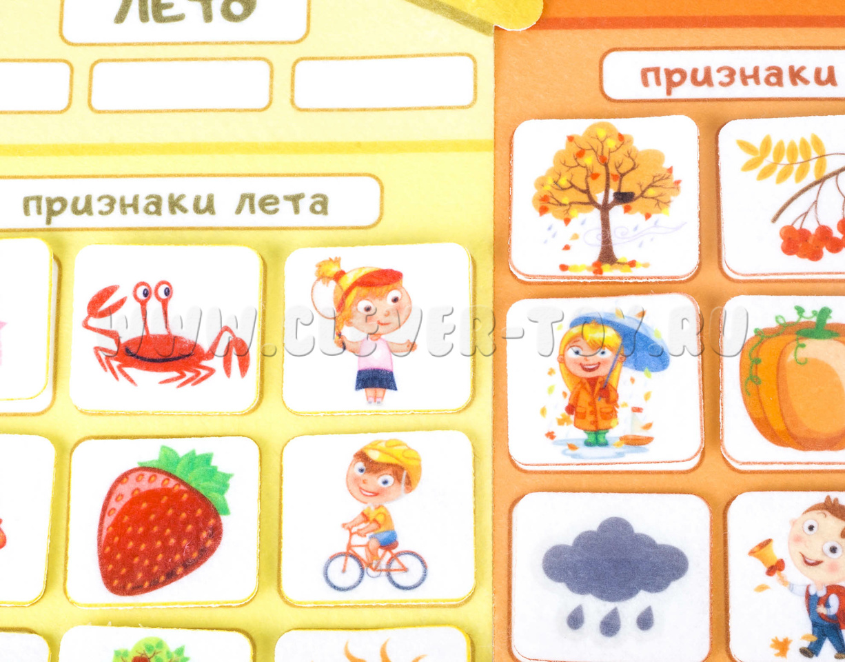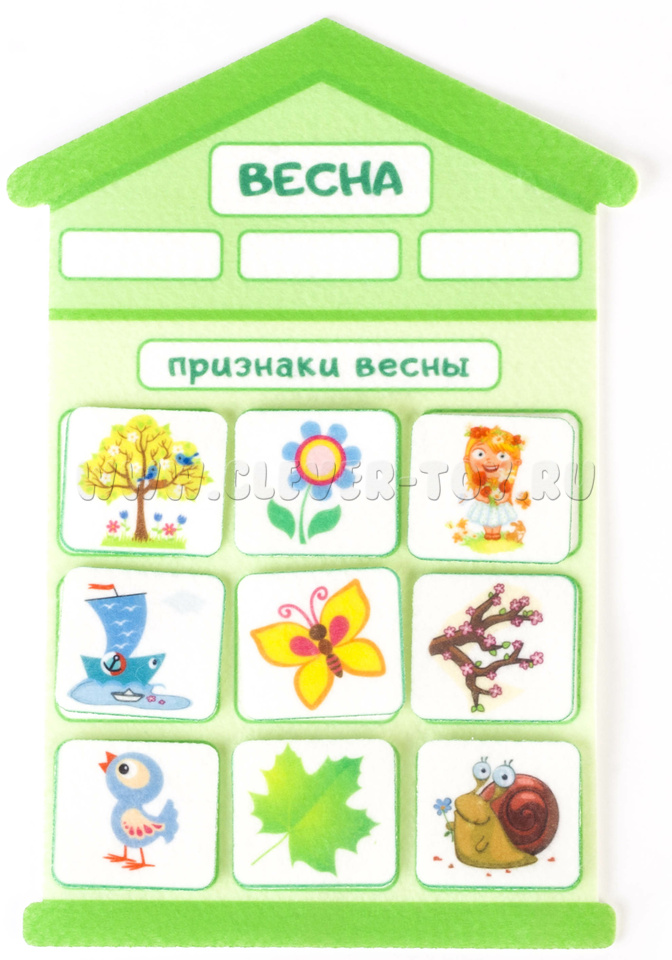 Игровой набор "Признаки времен года" -это аппликация, с помощью которой детям будет легкозакрепить знания о том, что такое зима, весна, лето и осень, запомнить их последовательность и главные признаки.