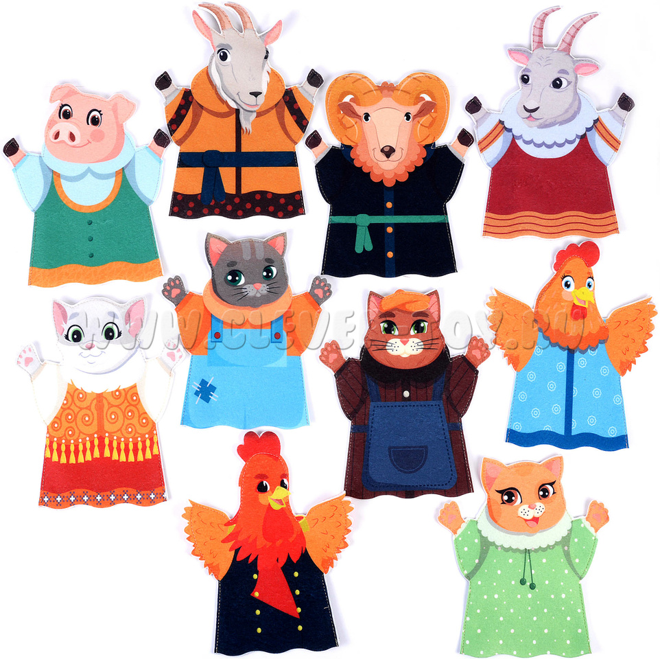 В набор входят фигурки с изображением тёти Кошки, Кота Василия, Котёнка мальчика, Котёнка девочки, Барана, Курицы, Петуха, Козла, Козы, Свиньи. Средний размер фигурок 215*195 мм.