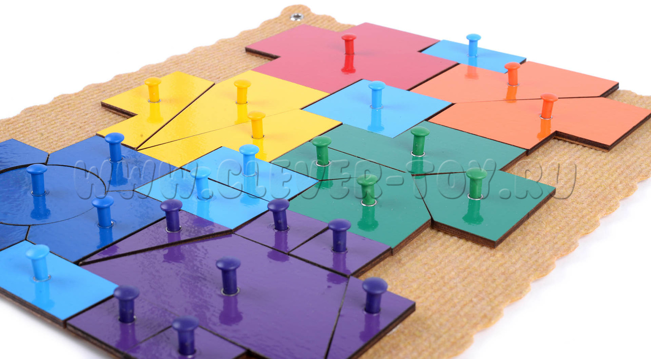 Крупные, яркие деревянные детали игрового пособия разделены на различные геометрические фигуры разной формы и величины, которые образуют 7 разноцветных крестиков. Из этих деталей ребёнок с помощью методических рекомендаций и подсказок взрослого может складывать фигуры:
