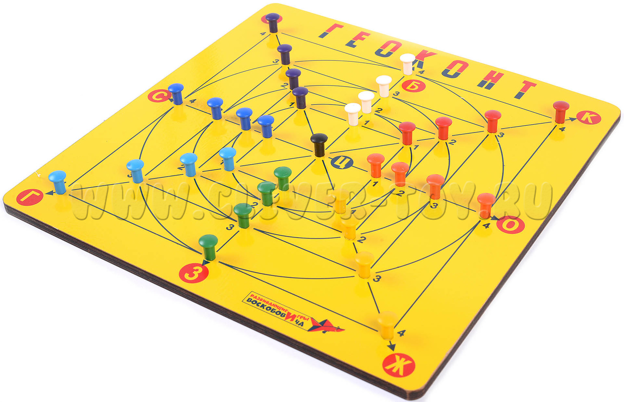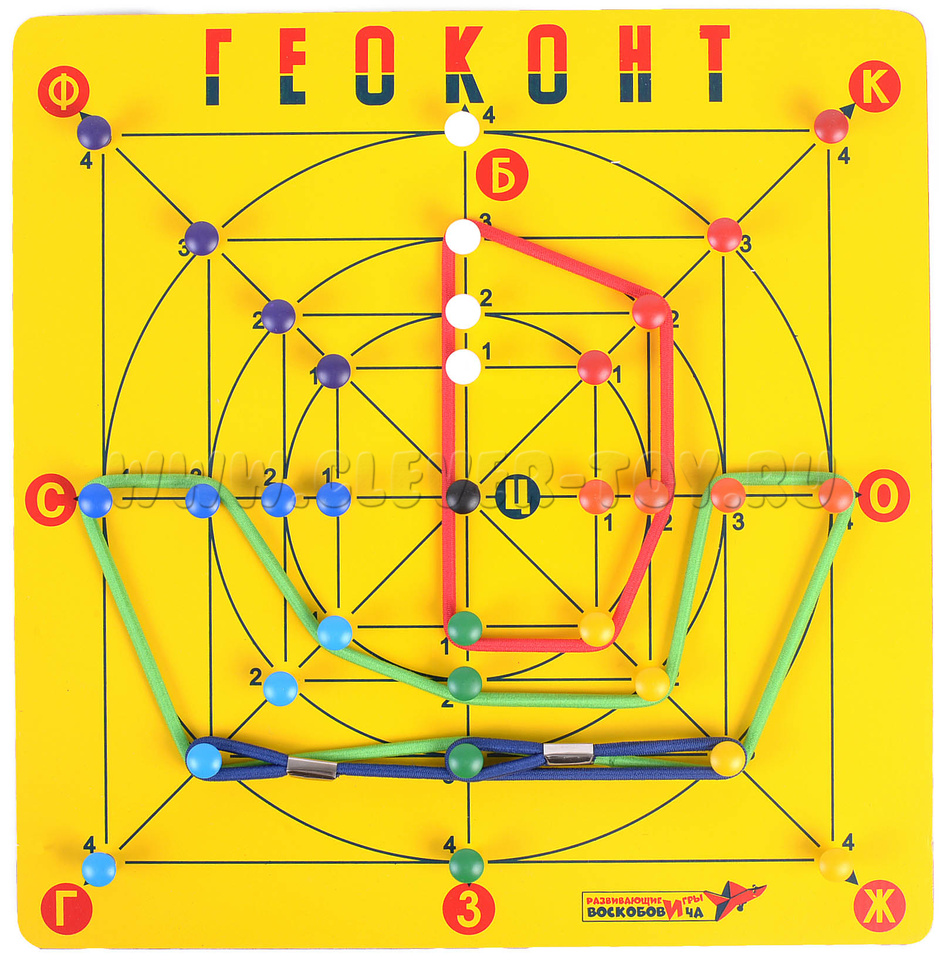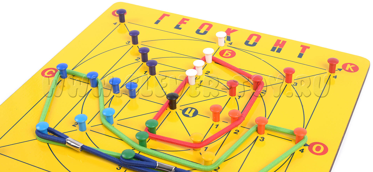 В игре "Геоконт" согласно определенным заданиям, ребенок натягивает резинки на гвоздики таким образом, что создает различные силуэты, геометрические фигуры, узоры, цифры, буквы - по образцу, словесному алгоритму или собственному замыслу.