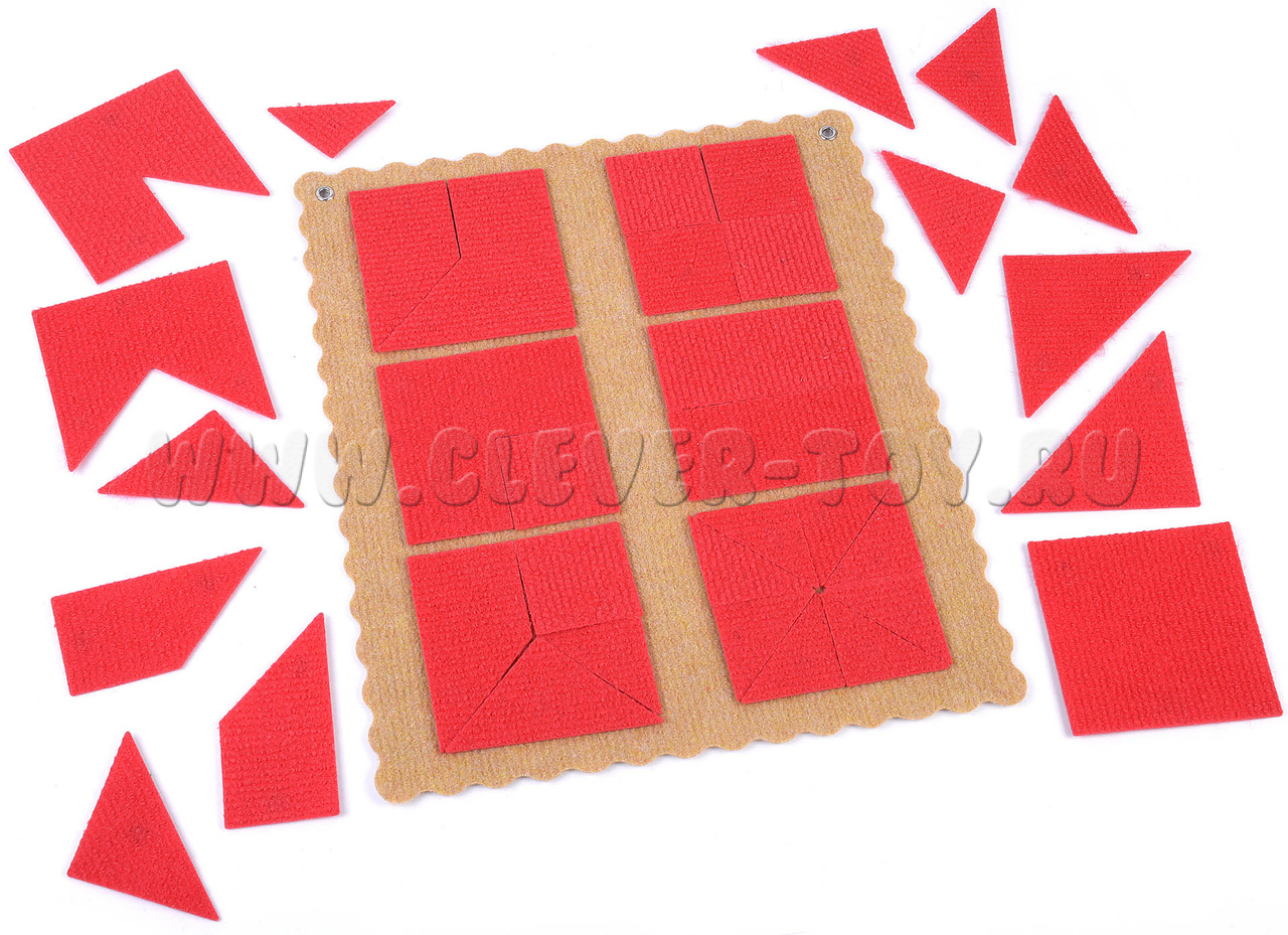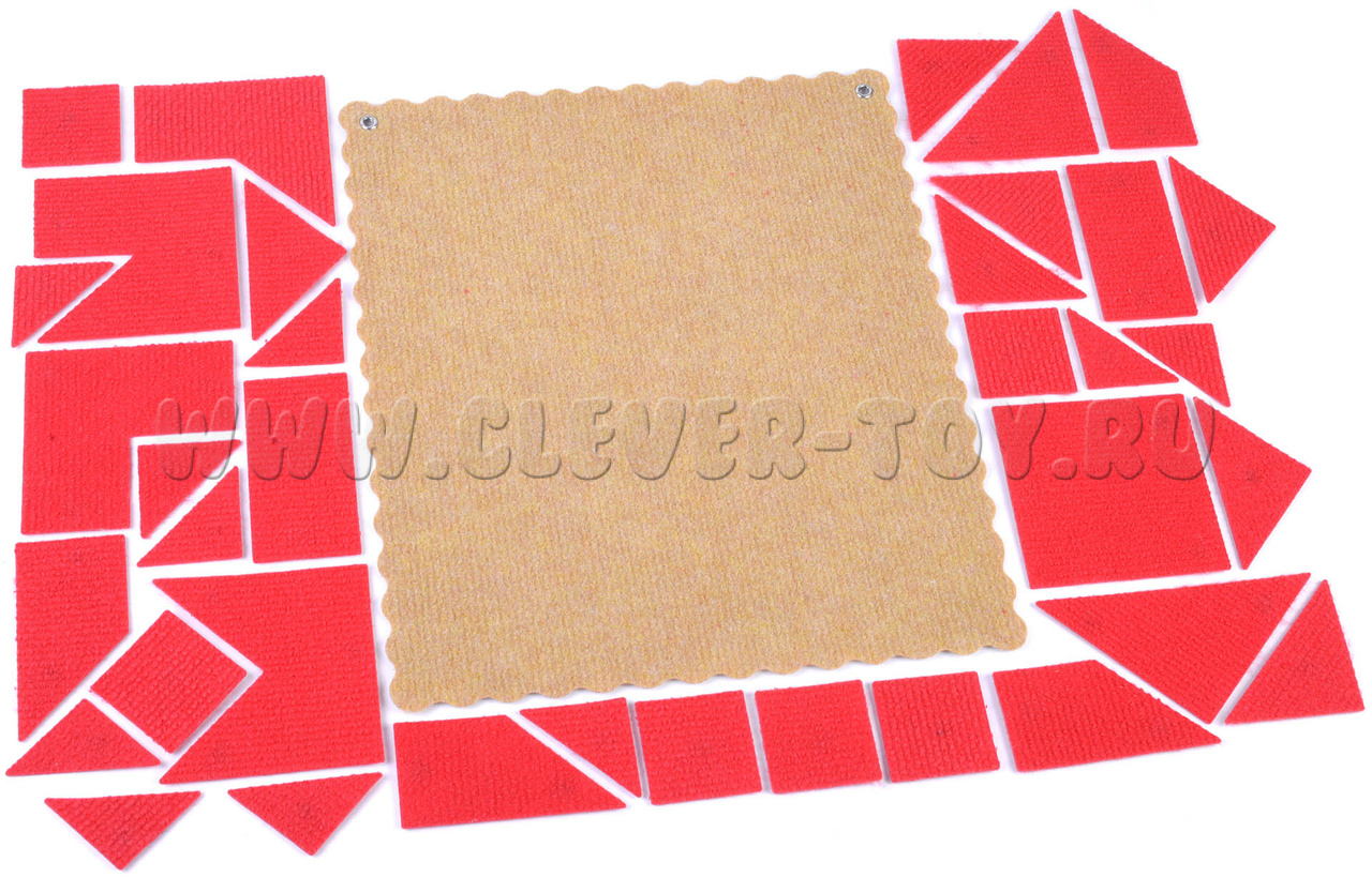 - 36 элементов из ковролина (многоугольник 1 – 1 шт., многоугольник 2 – 1 шт., многоугольник 3 – 1 шт., многоугольник 4 – 1 шт., треугольник маленький – 10 шт., треугольник средний – 7 шт., треугольник большой – 2 шт., квадрат большой – 1 шт., прямоугольник – 2 шт., трапеция 1 - 3 шт., трапеция 2 – 1 шт., квадрат маленький – 6 шт.;