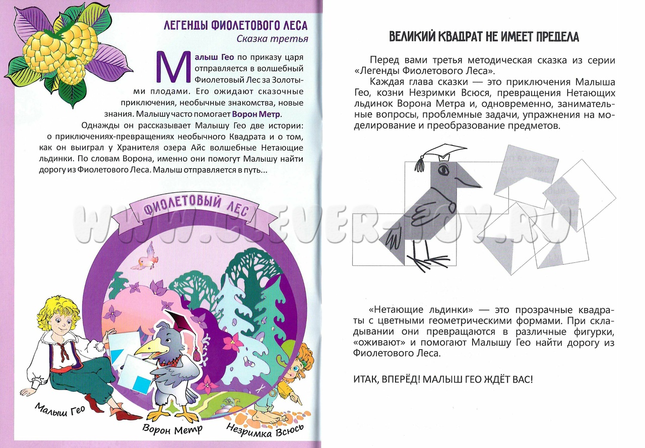 Третья методическая сказка из серии «Легенды фиолетового леса». Каждая глава книги – это чудесные превращения и приключения малыша Гео, козни НезримкиВсюся и занимательные вопросы, проблемные задачи, упражнения на моделирование и преобразование предметов.