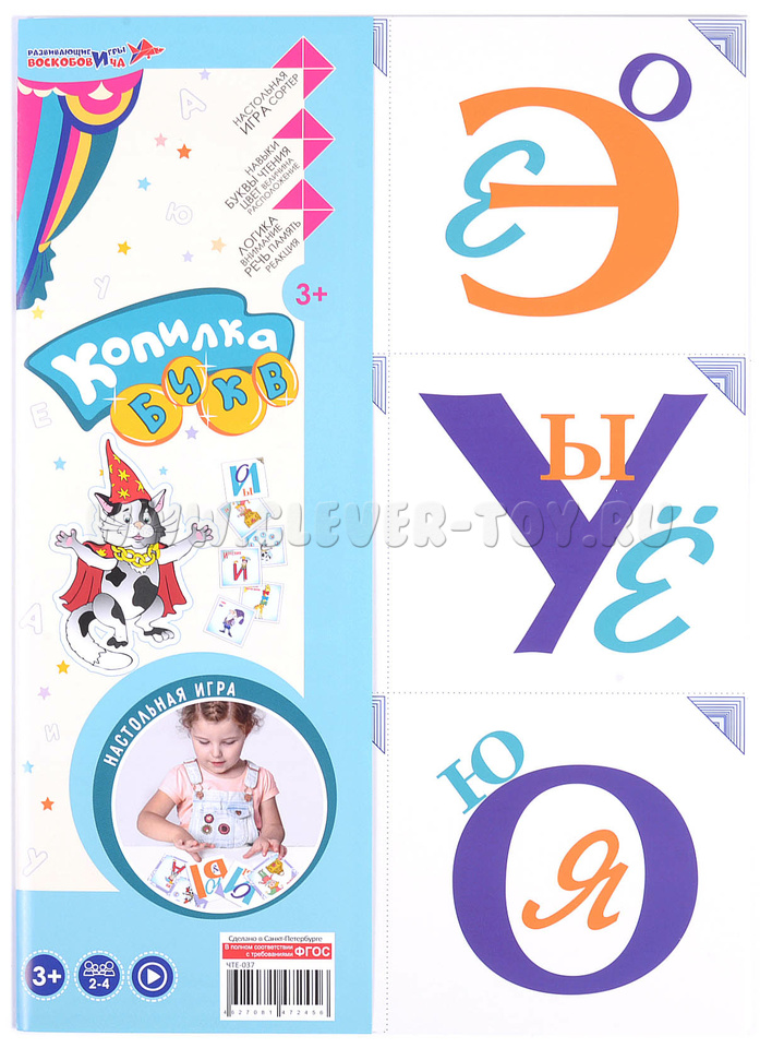 1. 48 картонных карточек (100х100мм): 24 игровых с гласными буквами, 24 призовых, обозначающих цвет, размер, положение (предлоги); цветная инструкция с правилами игр;