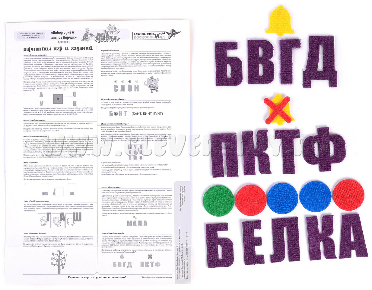 В комплект также входит инструкция с подробным описанием развивающих игр и занятий (с использованием других приложений серии «Ларчик»), в том числе: