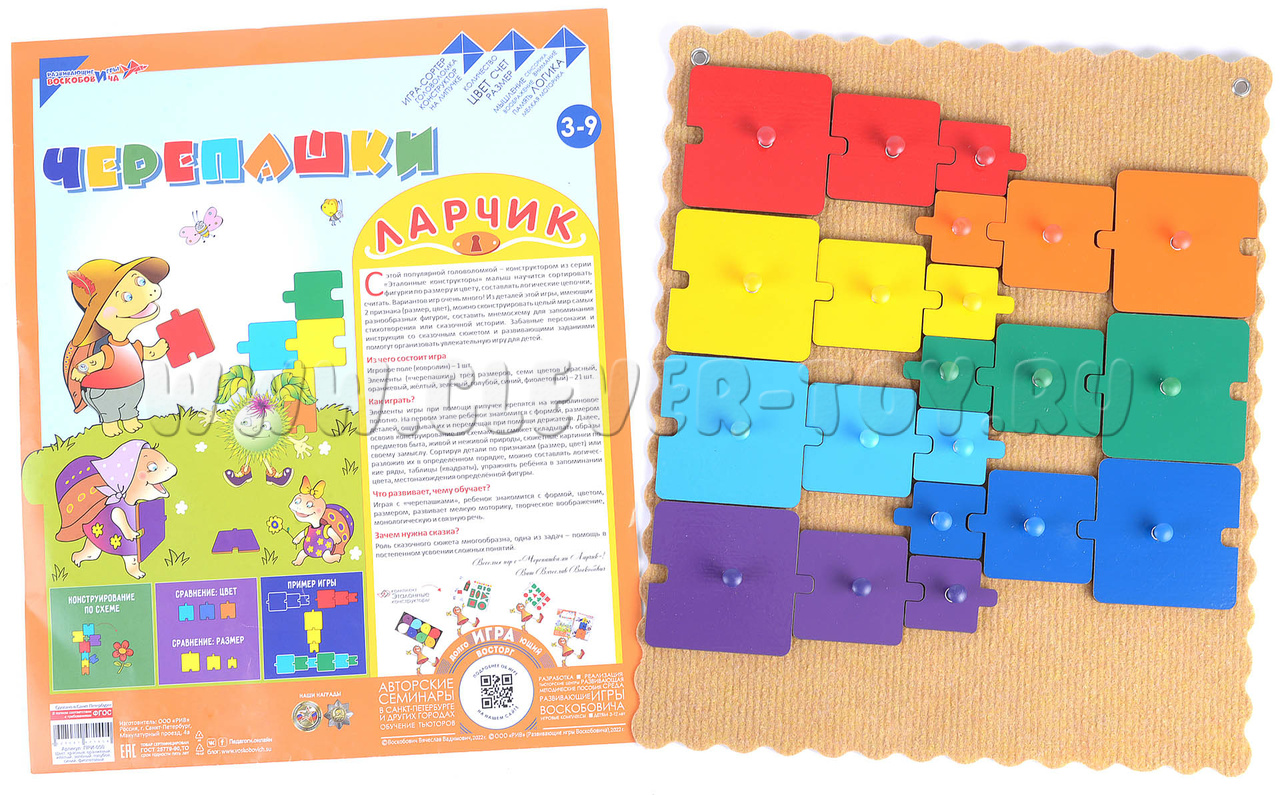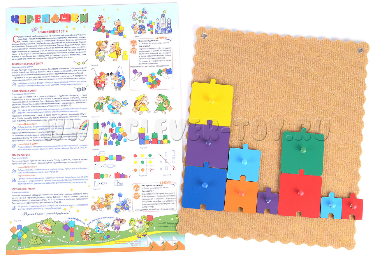 - фигурка-черепашка 21 штука 7-ми цветов радуги: 7 маленьких черепашек, 7 средних черепашек, 7 больших черепашек; все детали легко прикрепляются к игровому полю с помощью многоразовых липучек на оборотной стороне и специальных ручек на лицевой стороне каждой детали;