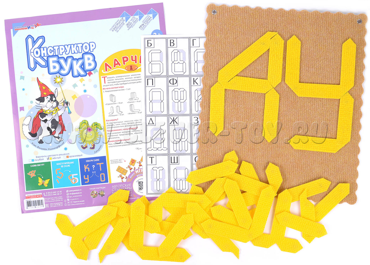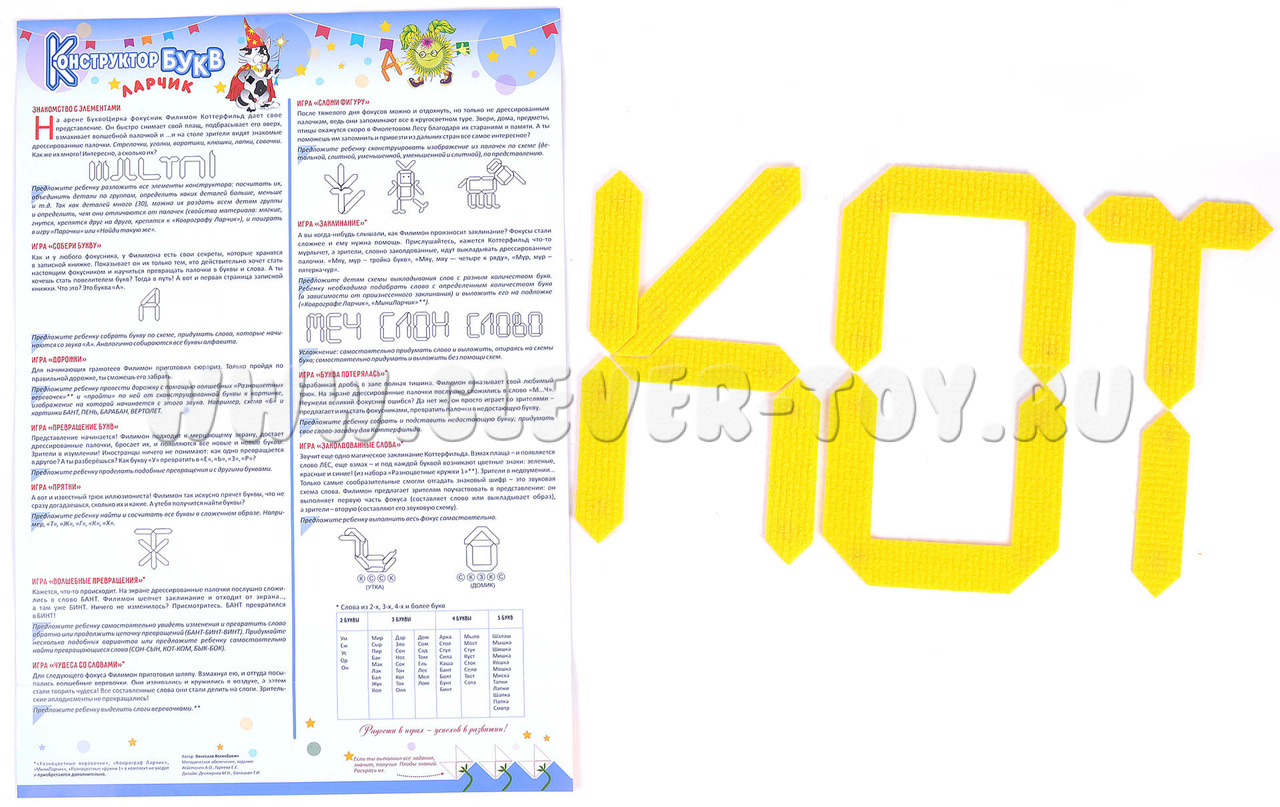 • увеличенная комплектация, позволяющая сконструировать не только одну букву, но и слоги, слова, состоящие из 2-6 букв,