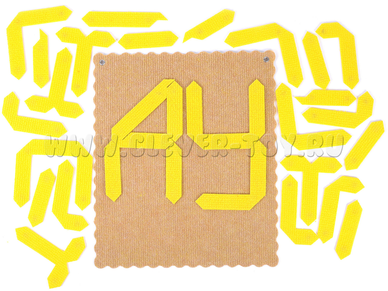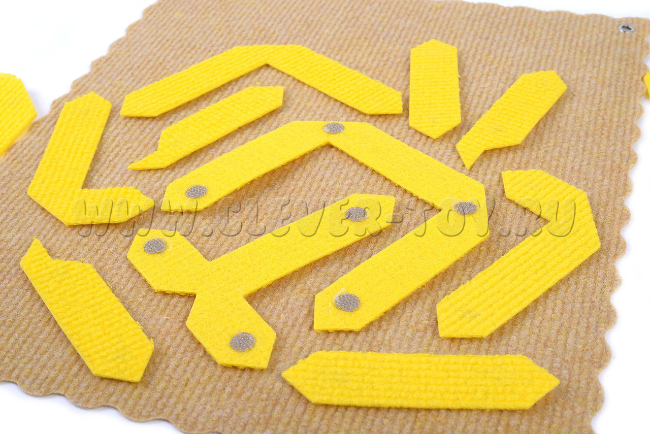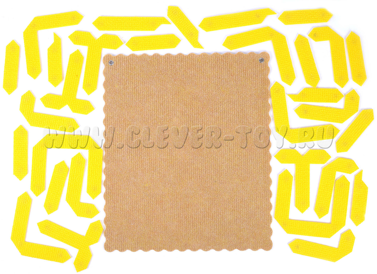 • 30 элементов из ковролина разной формы жёлтого цвета– «стрелочки» 8 шт., «уголки» 4 шт., «воротики» 2 шт., «клюшки» 6 шт., «лапки» 4 шт., «совочки» 6 шт.