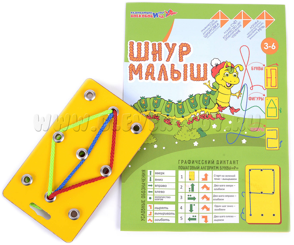 - Совершенствование интеллекта. В играх со «Шнуром-Малышом» у ребёнка развиваются психические процессы внимания, мышления, памяти, воображения и мелкая моторика рук.
