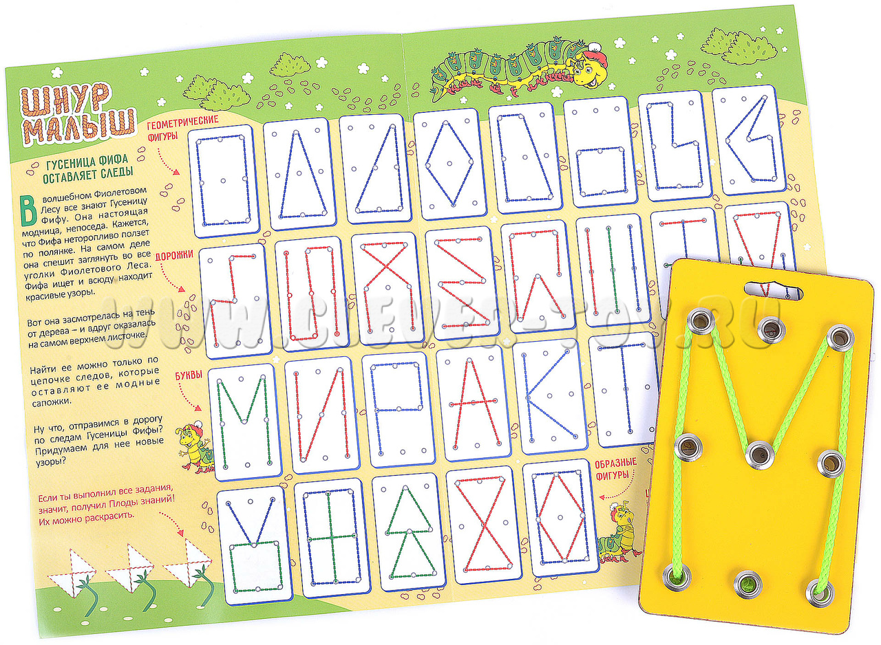 - Ориентировка в пространстве. Будущему школьнику важно уметь находить на тетрадном листе заданные точки. С помощью «Шнура» вы сможете проводить «графические диктанты», создавать разноцветные дорожки, узоры, оригинальные изображения.