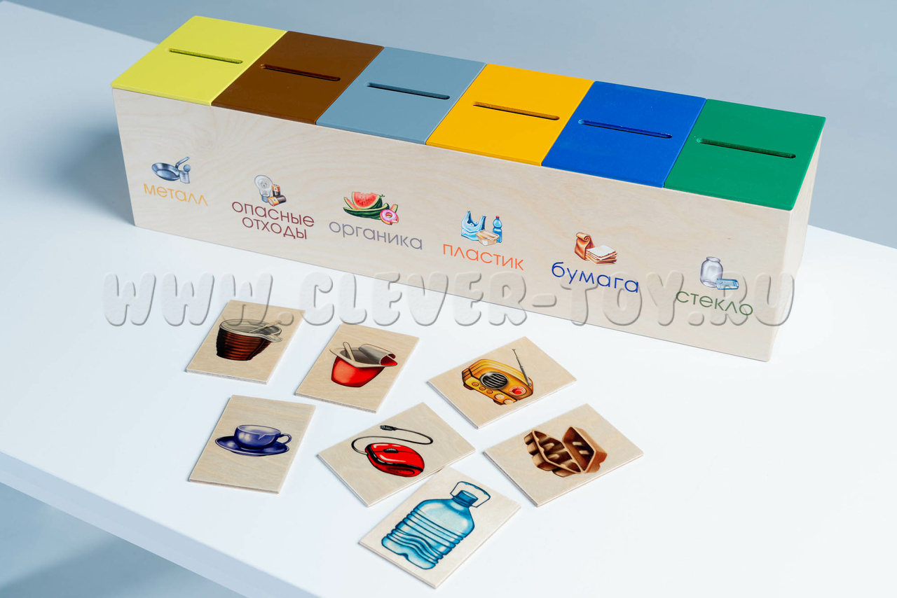 - Дидактическая игра по сортировке мусора (Комплект контейнеров для сортировки карточек с изображением типов мусора, карточки с изображением мусора – 60 шт.);