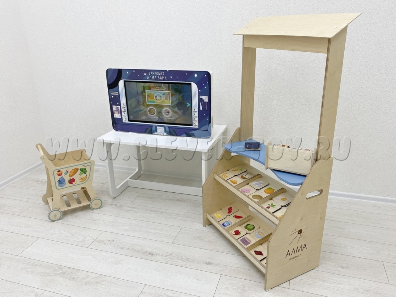 - Дополнительная атрибутика (детский киоск "Магазин" с кассой, тележкой и продуктами, макеты денег и пластиковых карт, копилки, кошельки, наборы для игры в группе на тему уроков).