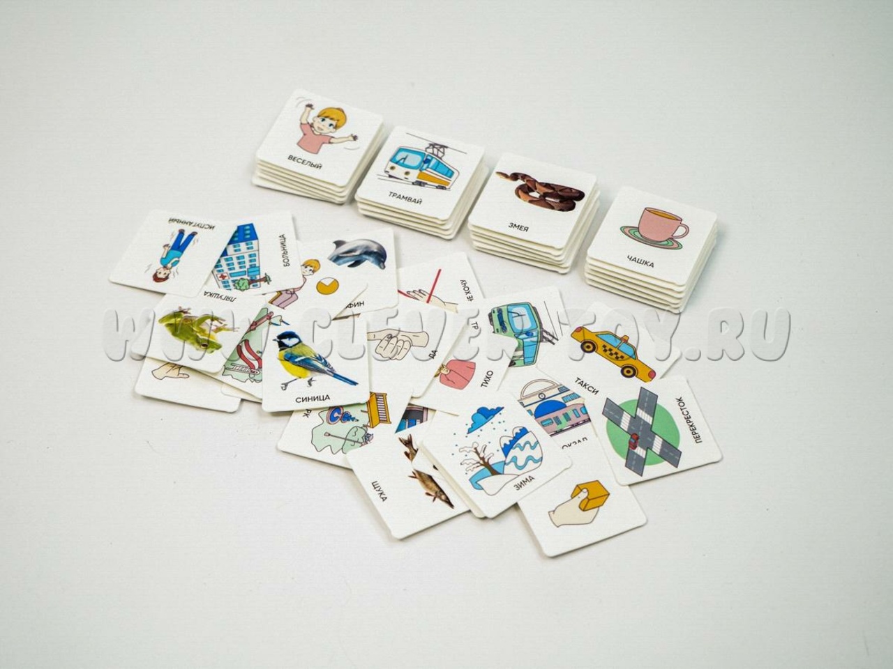 - Категории карточек в наборе: одеваюсь, игрушки, поликлиника, дом, ягоды и фрукты, еда, улица, действия, что нельзя делать, школа, состояние человека, детская площадка, части тела, питомцы, животные, поощрения.