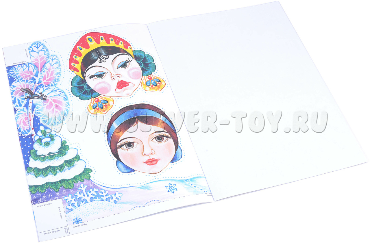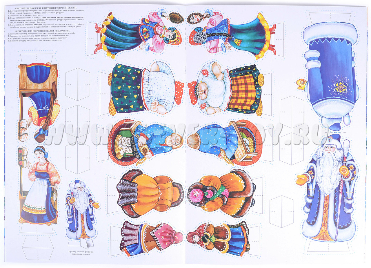 - Фигурки-персонажи которые изготовлены из плотного картона всего 7 фигурок (старухина дочь(2), морозко, старуха, старикова дочь(2), старик). Ребенок должен вырезать данные фигурки по пунктирным линиям, согнуть пополам и склеить клеем;