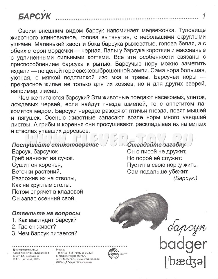 Состав комплекта (16 карточек): Барсук, Белка, Бобр, Бурундук, Волк, Выдра, Горностай, Горный баран, Дикая свинья, Ёж, Заяц, Змея, Зубр, Косуля, Крот, Куница