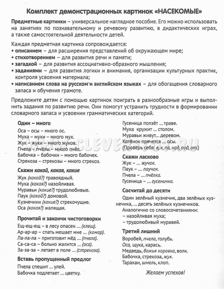 На лицевой стороне каждой картинки дается цветное изображение насекомого - краткое описание, стихотворение, загадка и вопросы по теме. Название каждого насекомого имеет перевод на английский язык и соответствующую транскрипцию. Материал излагается доступным для ребенка языком и целиком раскрывает тему.