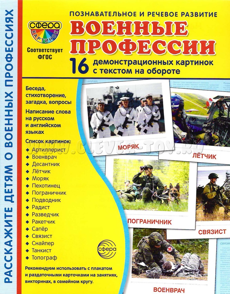 Комплект серии "Сфера картинок" под названием "Военные профессии" состоит из 16 цветных демонстрационных карточек (картинок) и адресован детям и их родителям, желающим познакомиться с современными военными профессиями, узнать много интересного из жизни военнослужащих разных родов войск.