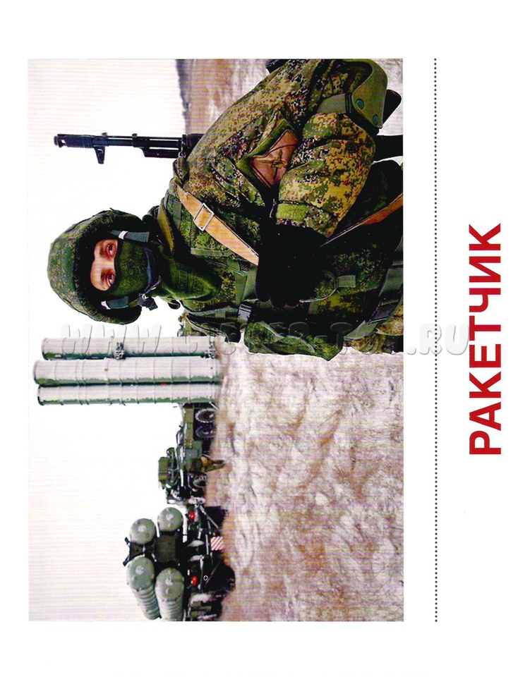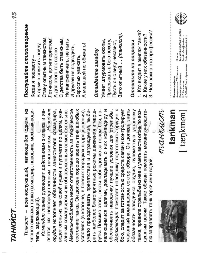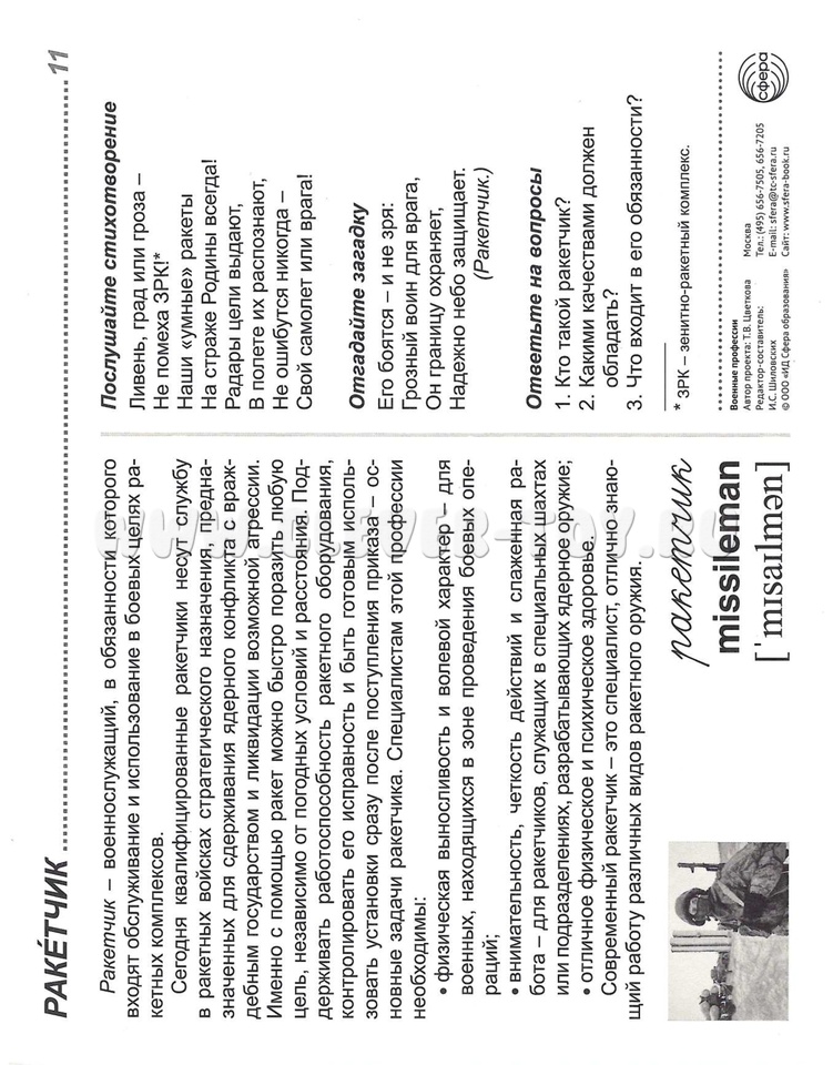 На лицевой стороне каждой карточки дается цветное изображение военнослужащего определенной военной специальности, на обратной - подробное описание, из которого дети узнают немало важных фактов о военной службе и образцах вооружения. Для лучшего закрепления материала представлены оригинальные стихотворения и рифмованные загадки по теме, а также вопросы, на которые ребенок ответит после изучения материала или беседы со взрослым.