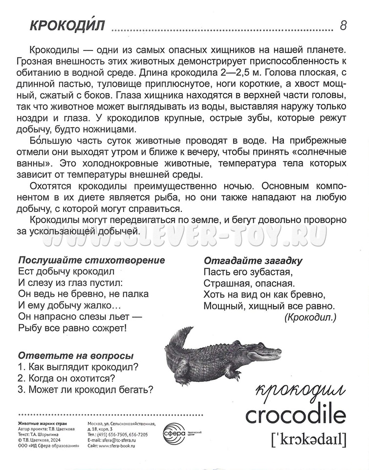 На лицевой стороне каждой карточки дается цветное изображение животного, на обратной - подробное описание, из которого дети узнают много интересного и поучительного. Для лучшего закрепления материала представлены оригинальные стихотворения и рифмованные загадки по теме, а также вопросы, на которые ребенок ответит после изучения материала или беседы со взрослым.