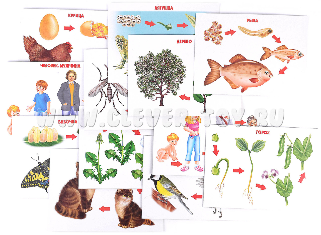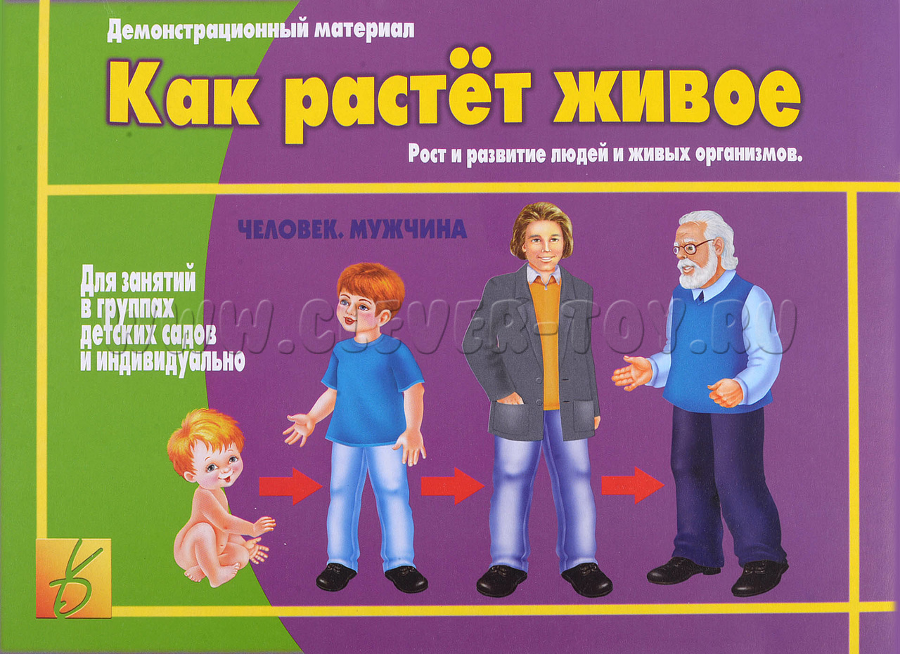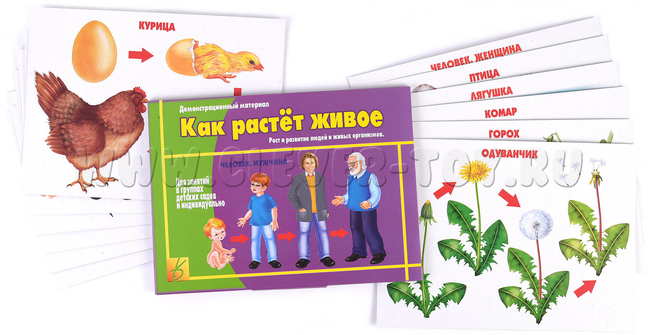 Демонстрационный материал предназначен для занятий в группах детского сада и индивидуально, он поможет сформировать понятие этапов развития человека, растения, животного, рыбы и других. С помощью этих картинок ребенок узнает все этапы роста организма, что в дальнейшем поможет ему шире познать окружающий нас мир.