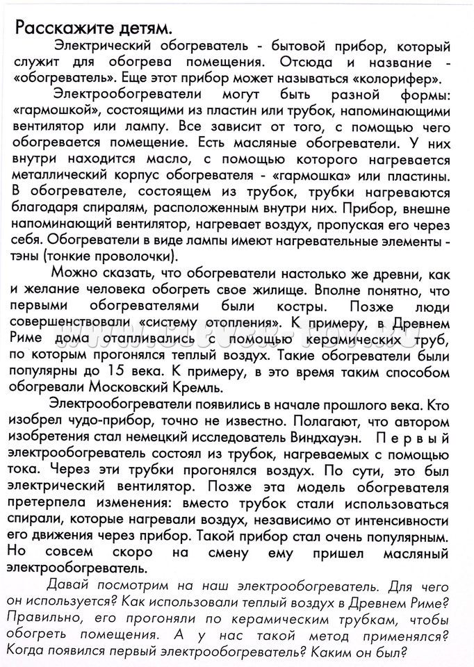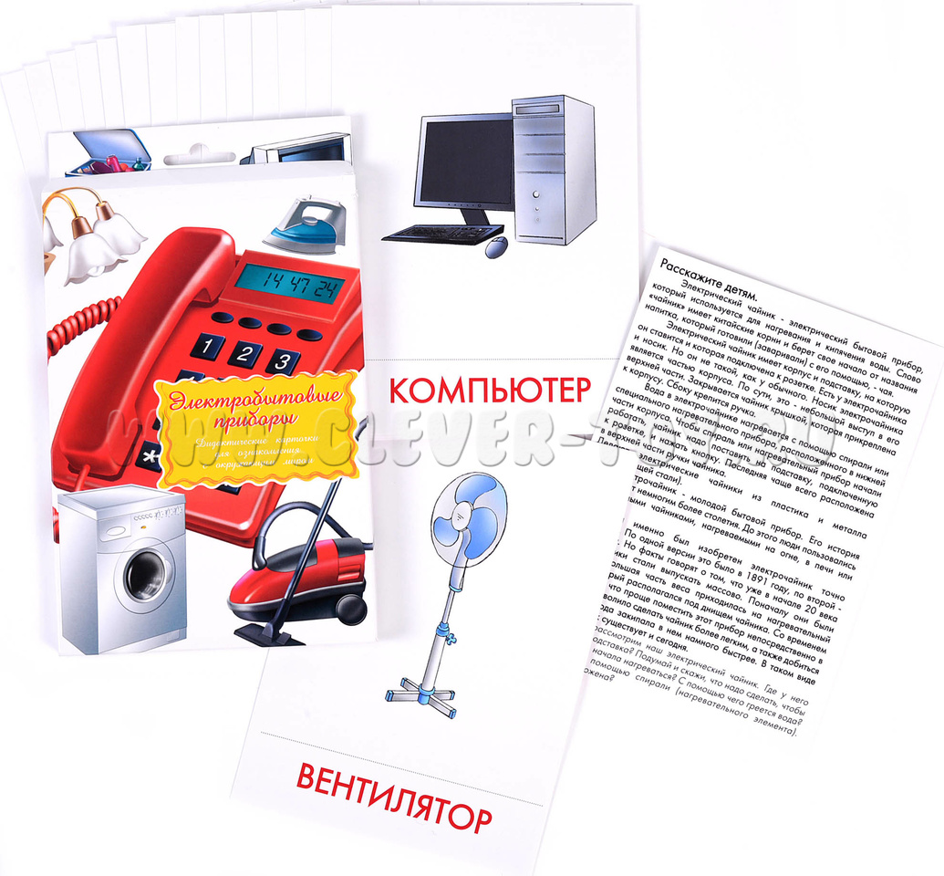 На одной стороне карточки расположена яркая картинка с изображением электробытового предмета (изображение детальное и реалистичное), на обратной стороне – доступная для ребёнка информация о предметах (описывает внешний вид предмета, его историю, особенности конструкции). Также на обратной стороне карточки родители и педагоги найдут вопросы, которые нужно задать ребёнку. Например: «Для чего создавались первые компьютеры?», «Где расположен винт у вентилятора?», «Чем отличается стационарный и мобильный телефон?», «Давай вместе вспомним, когда появился первый телевизор» и т.д.