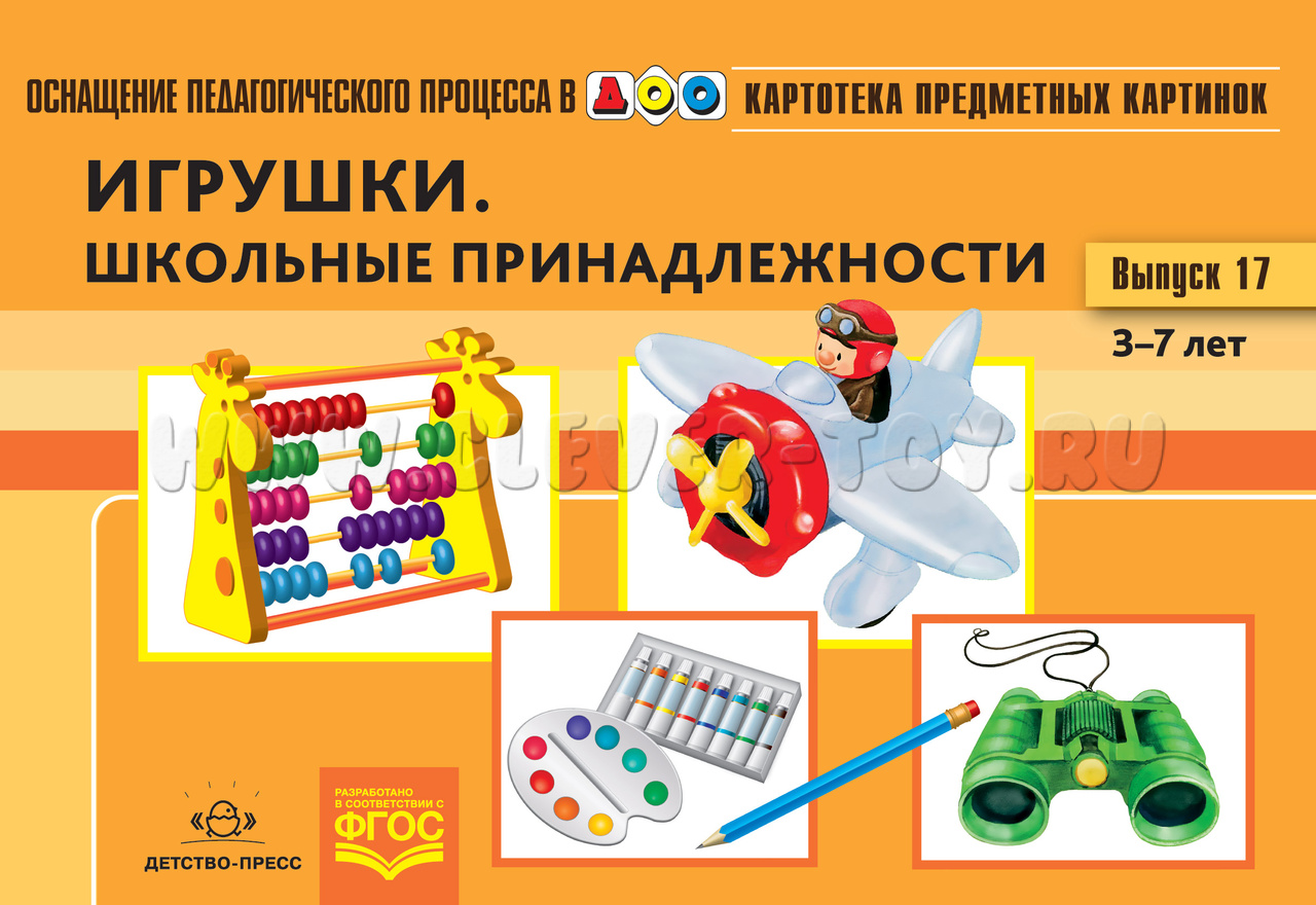 Картотека предметных картинок 17. Игрушки. Школьные принадлежности. 3-7 лет. ФГОС. Дидактич.материал