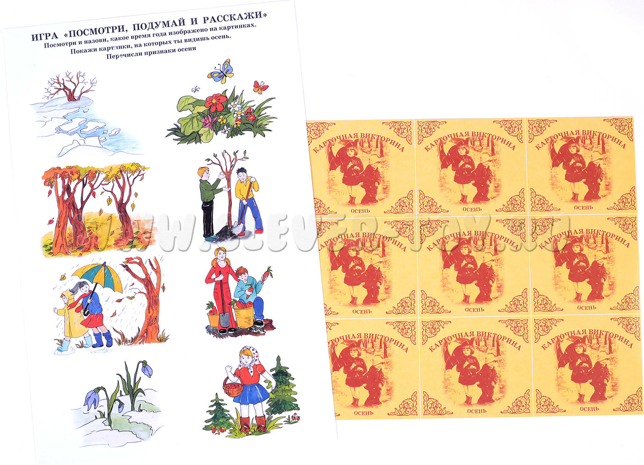 - 10 красочных изображений, иллюстрирующих изменение погоды, явления природы, виды деятельности, на обороте - список признаков осени, пословицы и приметы, загадки, планы развивающих и подвижных игр;