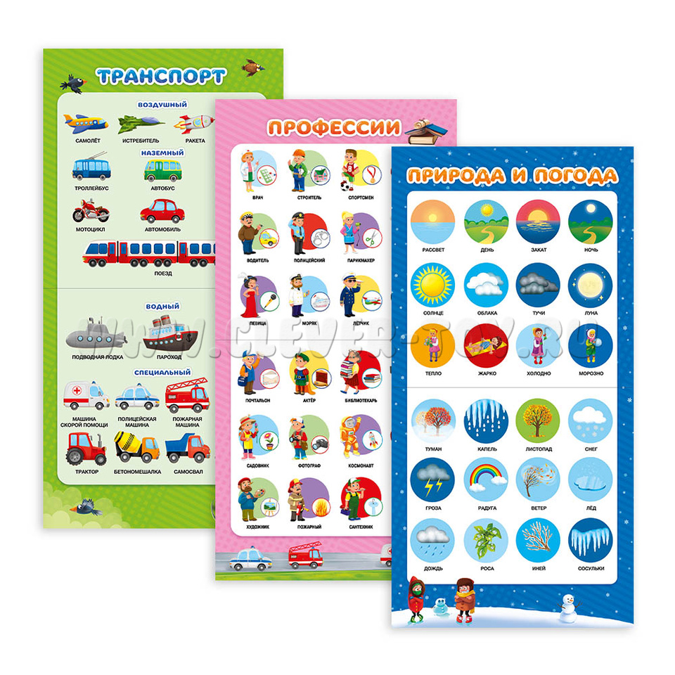 Сборник состоит из 9 обучающих плакатов, с помощью которых ребенок познакомится с буквами русского и английского алфавита, цифрами, животными, фруктами, овощами и ягодами, транспортом, профессиями и природными явлениями.
